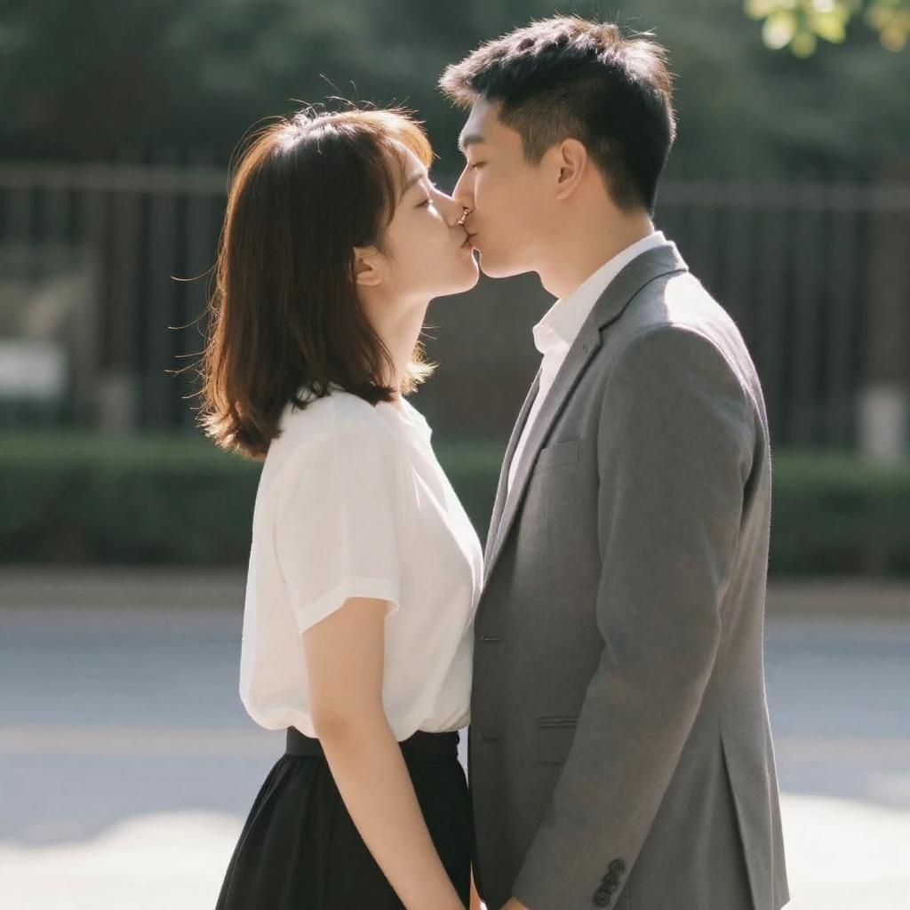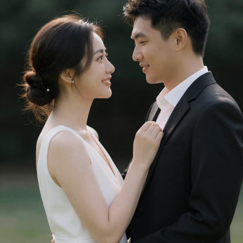 Photograph of a romantic moment between a man and woman in a dimly lit, outdoor setting at dusk. The woman, with short dark hair and a strapless black dress, leans in for a kiss. The man, in a dark suit, gazes at her with a smile. Background shows a blurred, illuminated waterfront with boats.