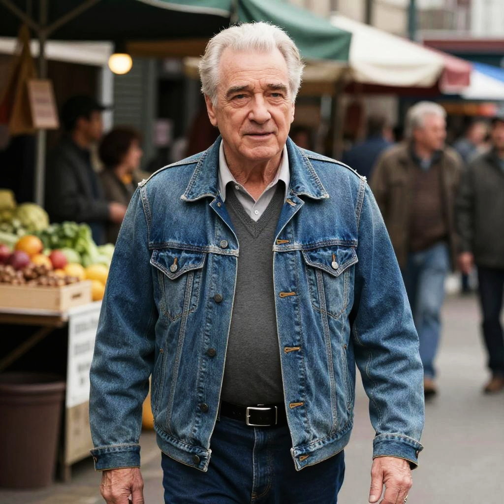 In a Martin Scorsese style setting, a man stands confidently at a bustling market scene, exuding an air of casual sophistication in his denim jacket and understated attire.