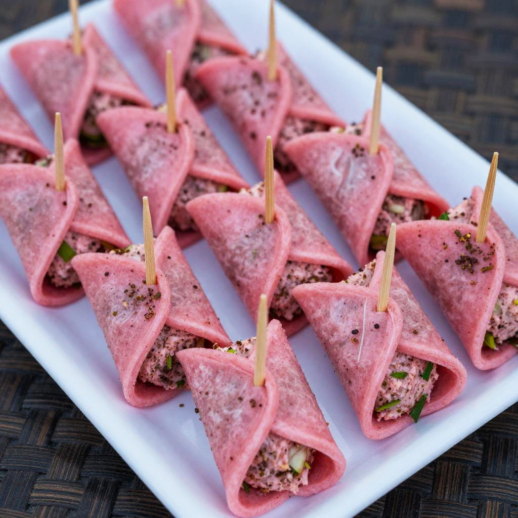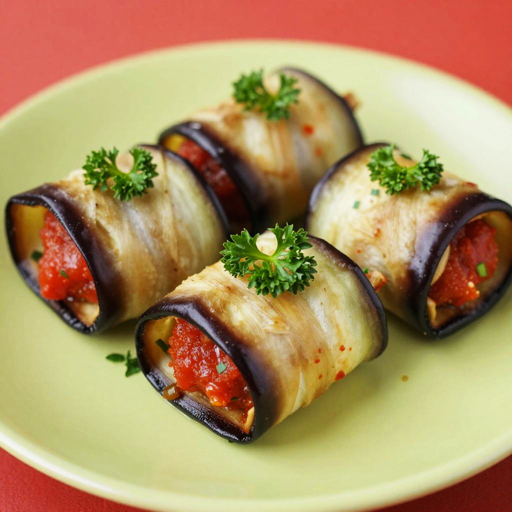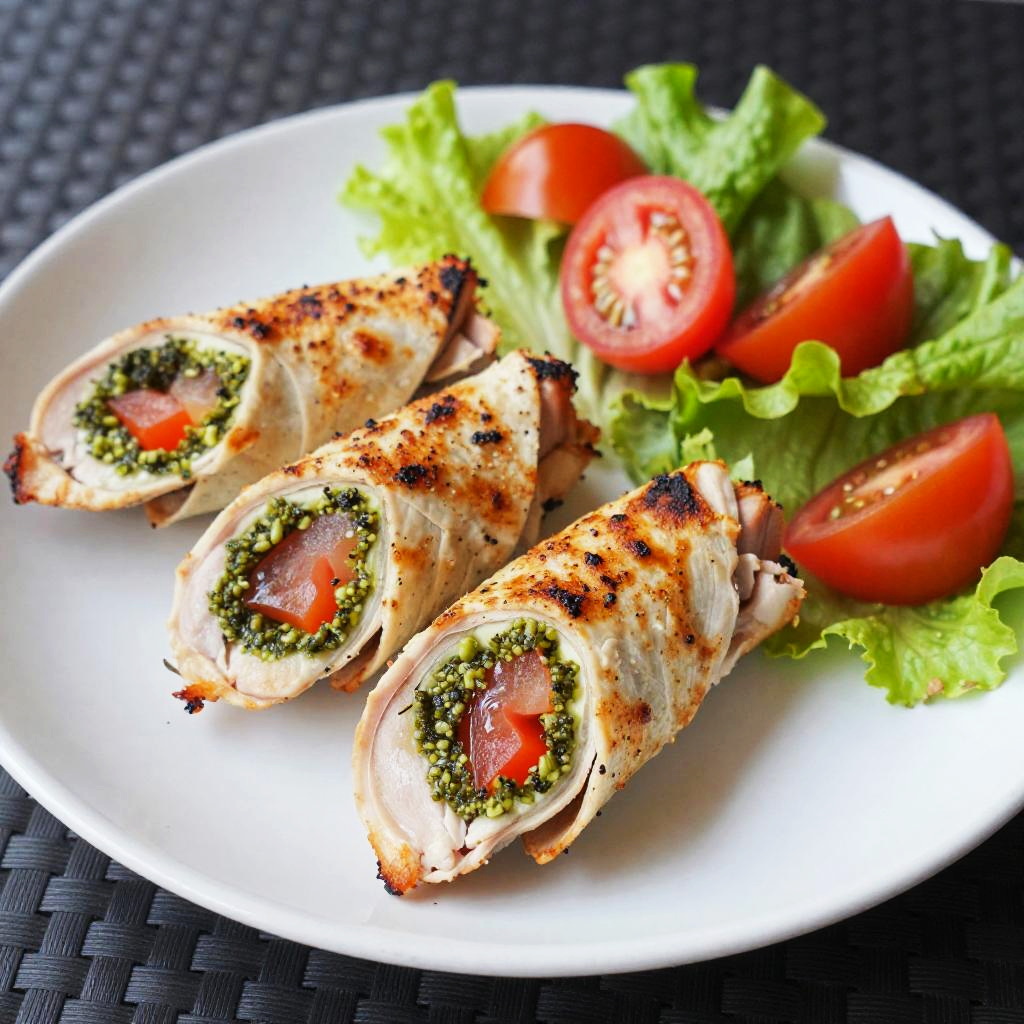 A close-up photo of a white plate holding three stuffed chicken rolls and a fresh salad. The chicken rolls are lightly browned with visible green pesto filling and red tomato slices inside. The salad is a mix of vibrant green lettuce and juicy red tomatoes. The plate is set on a black, woven tablecloth, adding a textured background. The image looks appetizing and colorful.