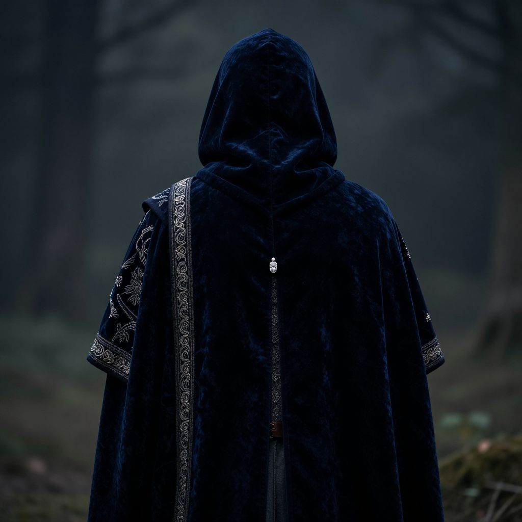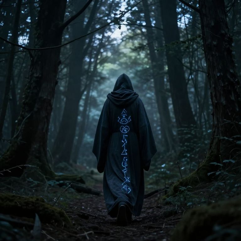Robed figure walking through a dark enchanted forest at twilight, ethereal light breaking through dense trees, mystical runes on the robe, fantasy art style