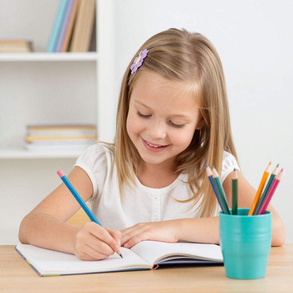 Cheerful child with blonde hair adorned by a purple flower clip sits attentively at a wooden desk, writing in an open notebook with a blue pencil while a teal cup containing four colorful pencils rests nearby.