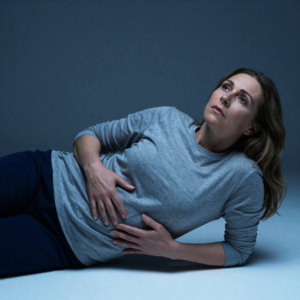 Photograph of a middle-aged woman with light brown hair lying on a blue-lit floor. She wears a gray long-sleeve shirt and blue pants. Her hands rest on her stomach, and her gaze is upward. Her expression is neutral. Background is a plain blue wall.