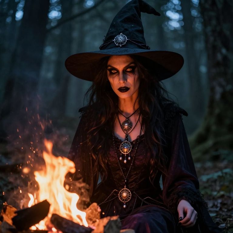 Photograph of a mysterious woman dressed as a witch in a dark forest. She has long, wavy black hair, dark makeup, and wears a large, pointed black witch hat adorned with a silver emblem. Her outfit includes a black dress with a low neckline, revealing a silver necklace with three circular, ornate pendants. She sits in front of a bright, orange campfire, casting flickering light on her pale skin. The background is dimly lit, with tall, shadowy trees. The overall atmosphere is eerie and enchanting, with the fire providing a stark contrast to the dark surroundings.
