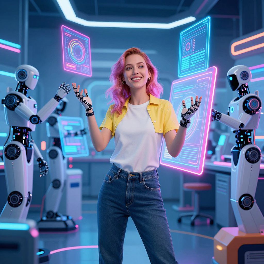 Photograph of a young woman with fair skin and wavy, shoulder-length blonde hair, wearing a shimmering silver and blue sequin one-piece bodysuit and matching knee-high boots. She stands confidently in a dark locker room with blue LED strip lighting, flanked by three small, white, robotic dolls with colorful accents and glowing screens. The woman's bold red lipstick contrasts with her outfit. The robots, positioned to her left, right, and slightly behind, add a futuristic, sci-fi element to the scene. The image has a vibrant, neon aesthetic.