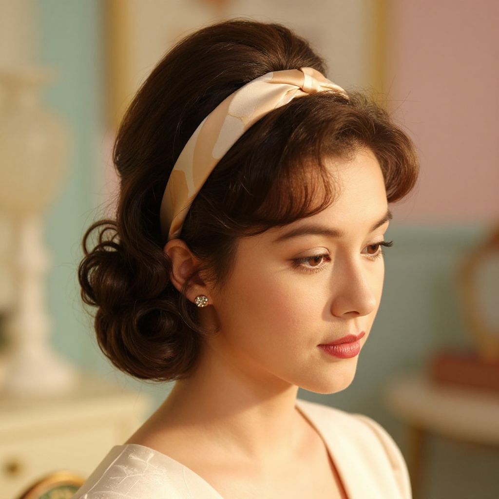 Vintage inspired scene capturing a woman with a classic beehive bouffant hairstyle, adorned with a silk headband, soft curls framing the face, warm sunlight highlighting the texture and volume, surrounded by retro decor and pastel tones