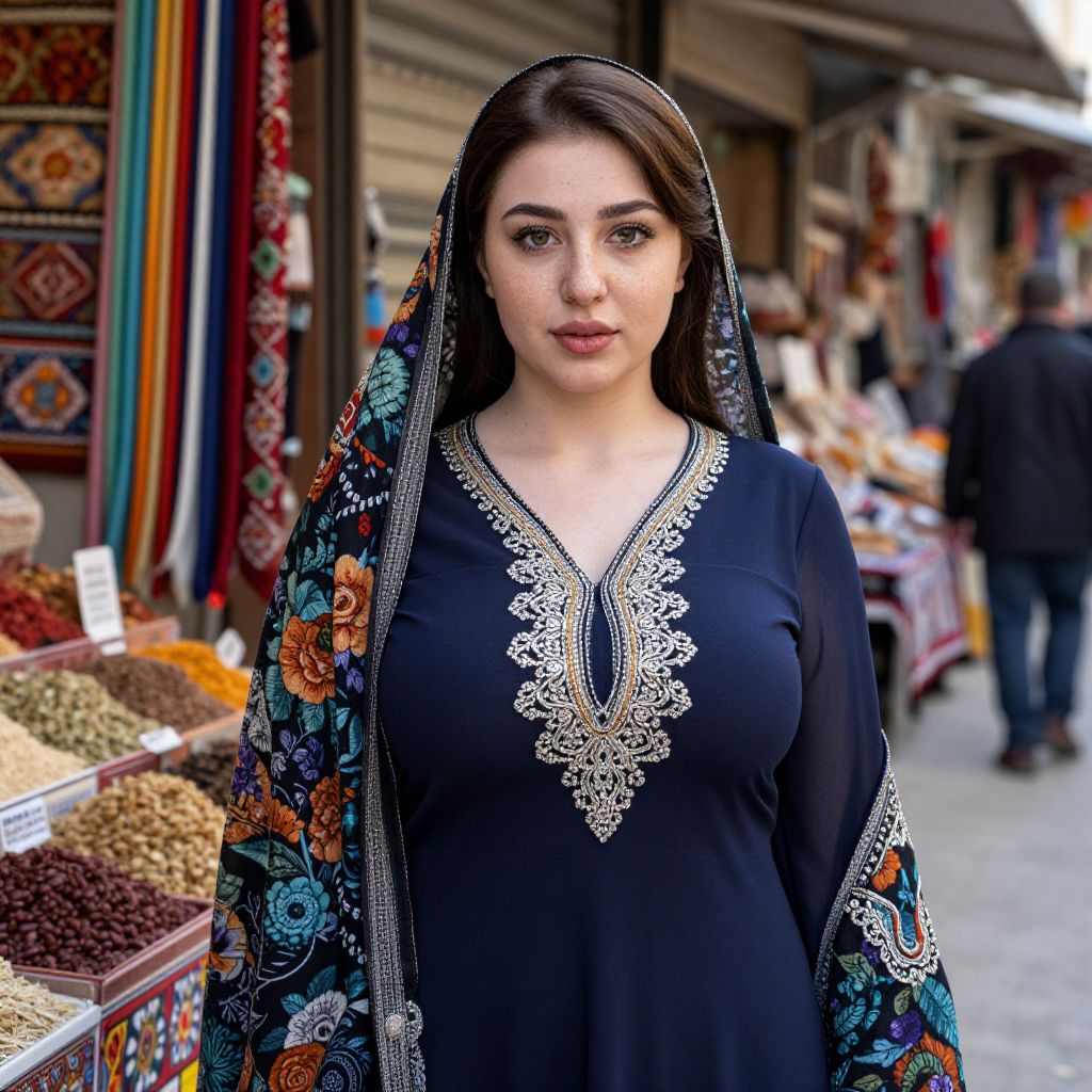 A young Kurdish woman with freckles, a strong nose, and expressive olive-green eyes, wearing a traditional Kurdish costume with intricate silver bead patterns on a dark blue long dress and a floral-patterned shawl draped over her shoulders, standing in a bustling market in Sulaymaniyah, near a spice stall with colorful fabrics and textiles on display.. The woman has big breasts and cute face