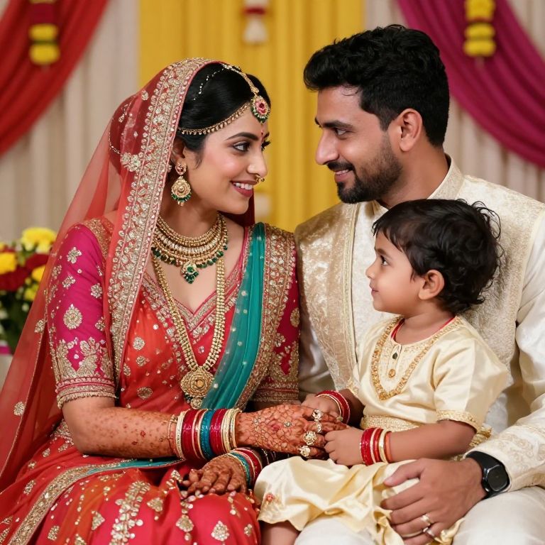 An ethereal tapestry of love and tradition unfolds as vibrant colors, intricate jewelry, and tender gazes weave a story of timeless connection and shared joy, capturing the essence of a sacred union amidst the warmth of familial celebration.