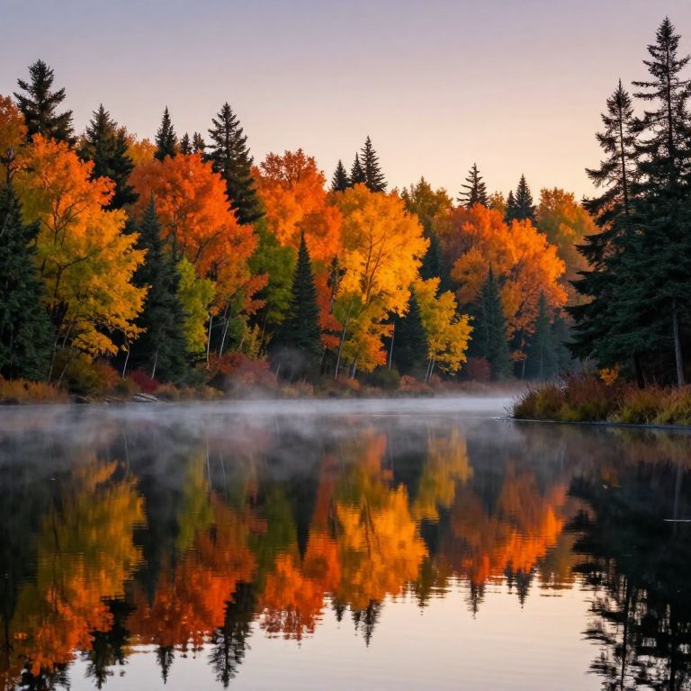 Sunrise bathes Little Bearskin Lake in vibrant autumn hues, casting fiery reflections of orange, yellow, and green trees across its tranquil waters, framed by misty shores and silhouetted evergreens under a gradient sky.