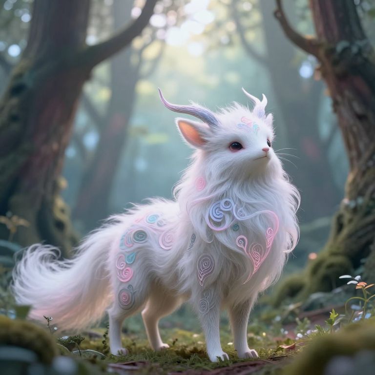Digital fantasy art of a white, fluffy, mythical fox-like creature with glowing, colorful spiral patterns in a mystical forest.