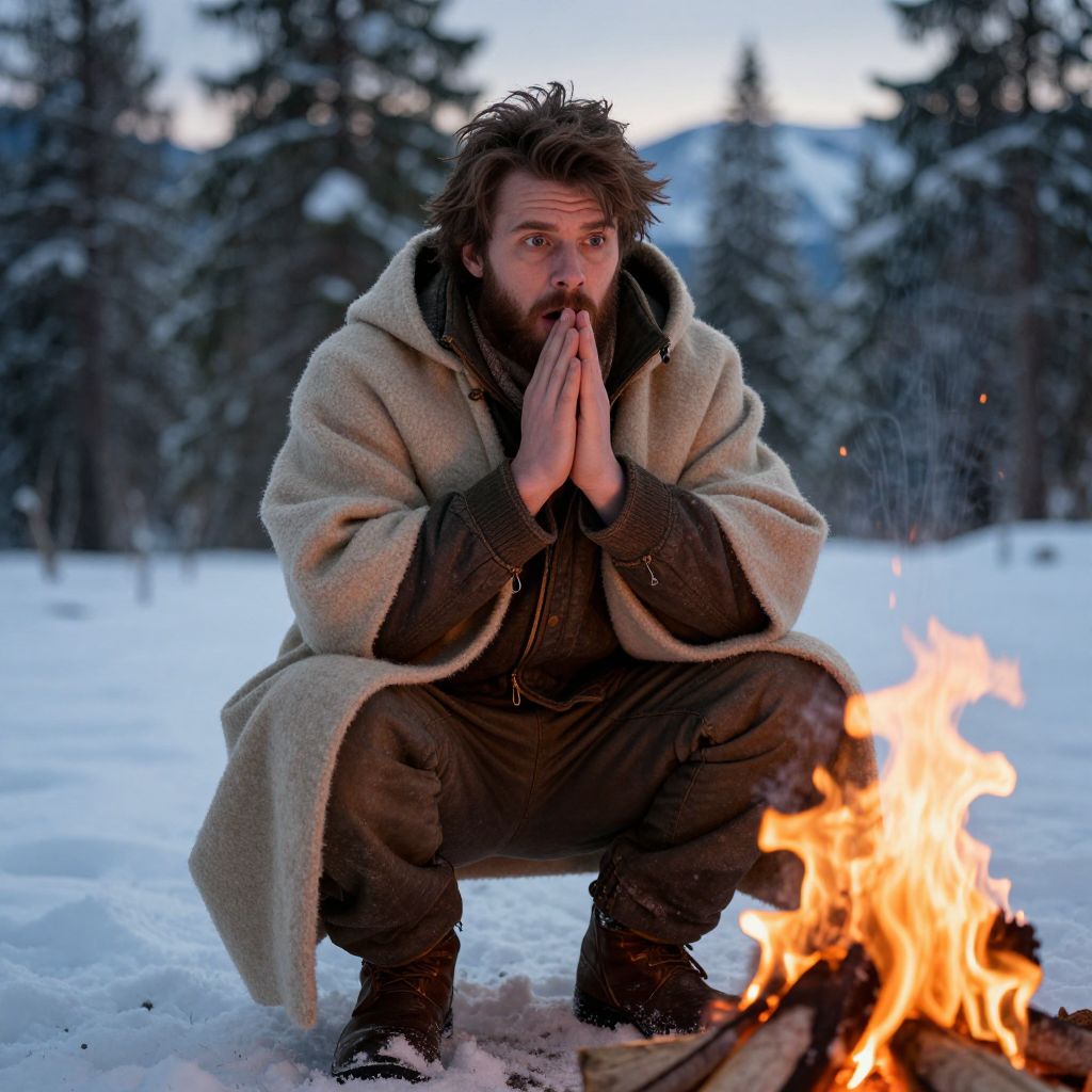 A quiet mountain cabin at dusk, where a man with a beard and steady, focused eyes sits by a window, watching a crystal light hang from a wooden beam, gently casting prismatic reflections on the wooden floor and snow-covered walls beyond.