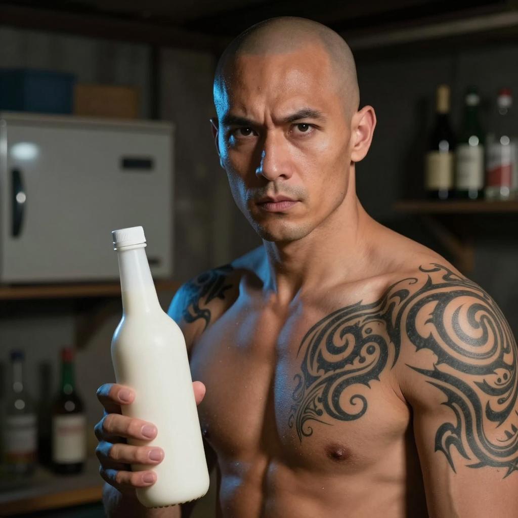 Photograph of a muscular man with a shaved head, white tank top, and black tribal tattoo on right shoulder, blowing on a fist. Six bald men with intense expressions in the background. Cityscape blurred in the background.