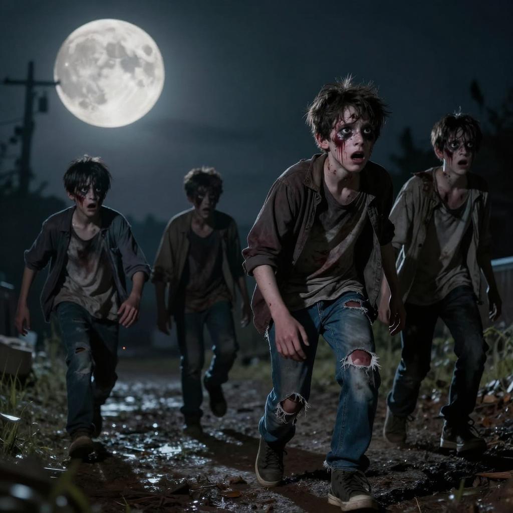 Multiple boys, (zombie), night, dark, scared, :o, shadow, night sky, backlighting, fleeing, motion, torn clothes, full body, depth of field, running towards viewer, horror, grabbing, shorts, perspective, (realistic:1.4), masterpiece, best quality, highly detailed