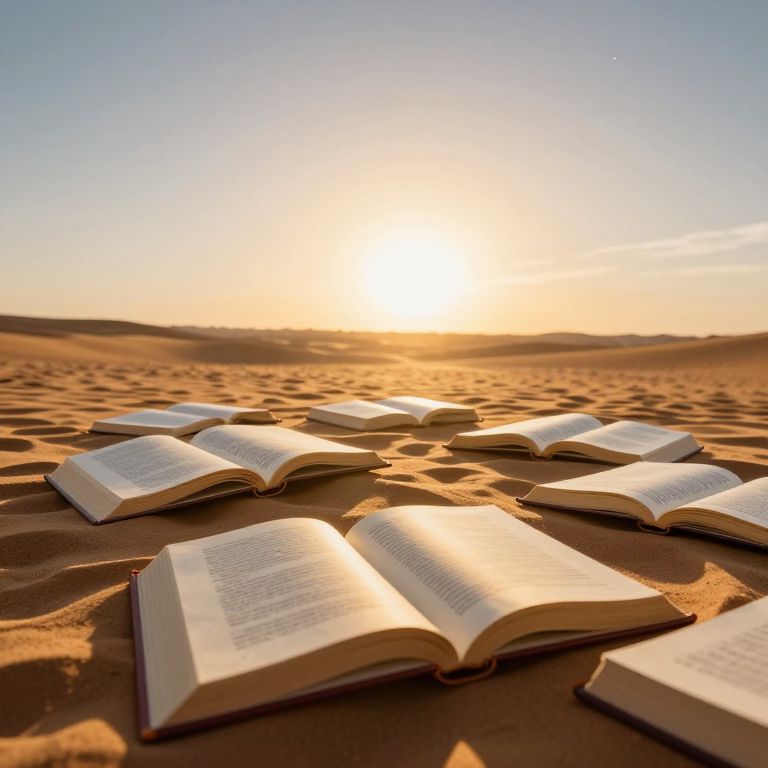 Photograph of an open book lying on a sunlit, sandy desert. Multiple open books are scattered across the golden, undulating sand, each angled slightly to catch the warm sunlight. The books' pages glow with the sunlight's reflection. The horizon shows a bright, setting sun casting a golden-orange hue across the sky, which transitions from a warm glow near the horizon to a clear, pale blue higher up. The sun's light creates soft shadows on the sand, enhancing the texture. The background is a vast, empty desert with no visible vegetation or structures.