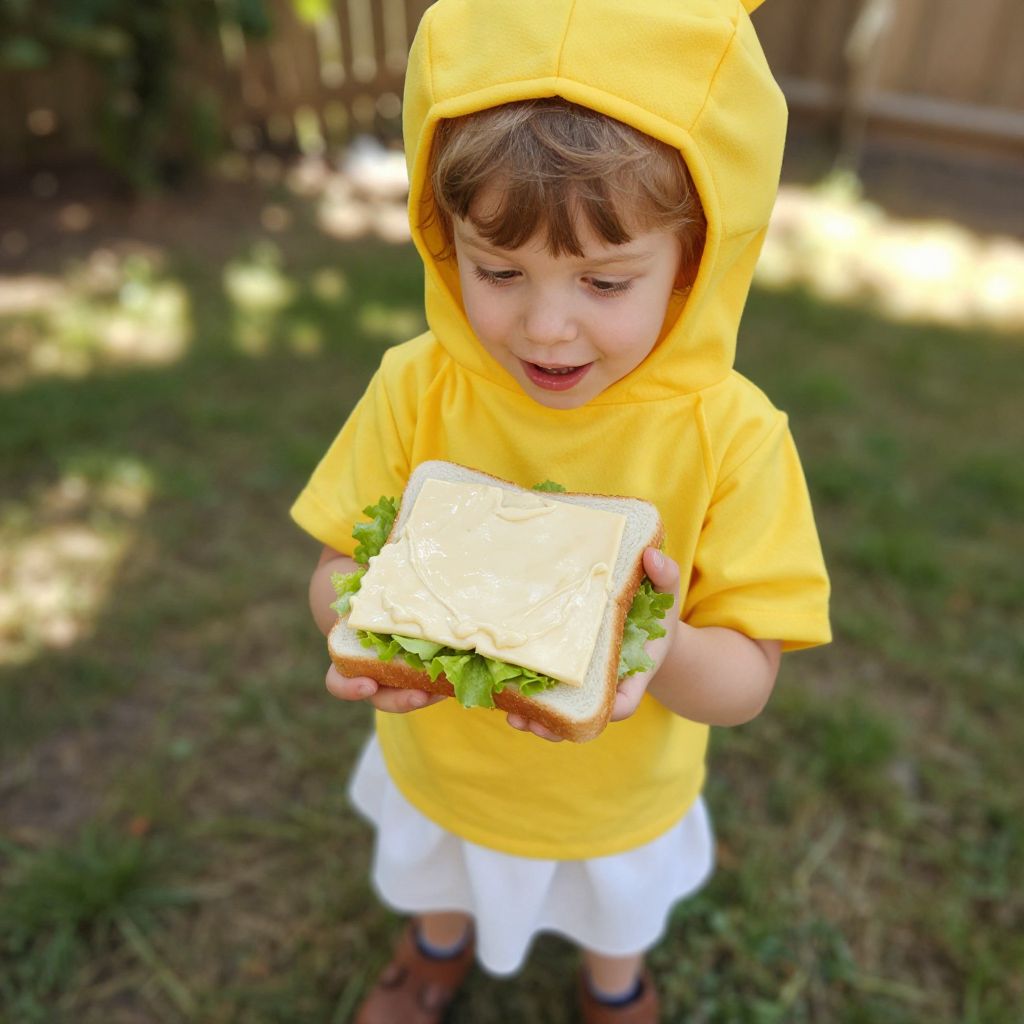 A young child, around 5 years old, is dressed in a bright yellow costume featuring a white skirt and brown shoes, standing in a sunny backyard. The child is holding a large, visually appealing sandwich with creamy cheese and fresh lettuce spread evenly across the bread. The scene is cheerful and warm, with soft sunlight filtering through the trees, and a slightly playful expression on the child's face as they look down at the sandwich with a mix of excitement and curiosity.