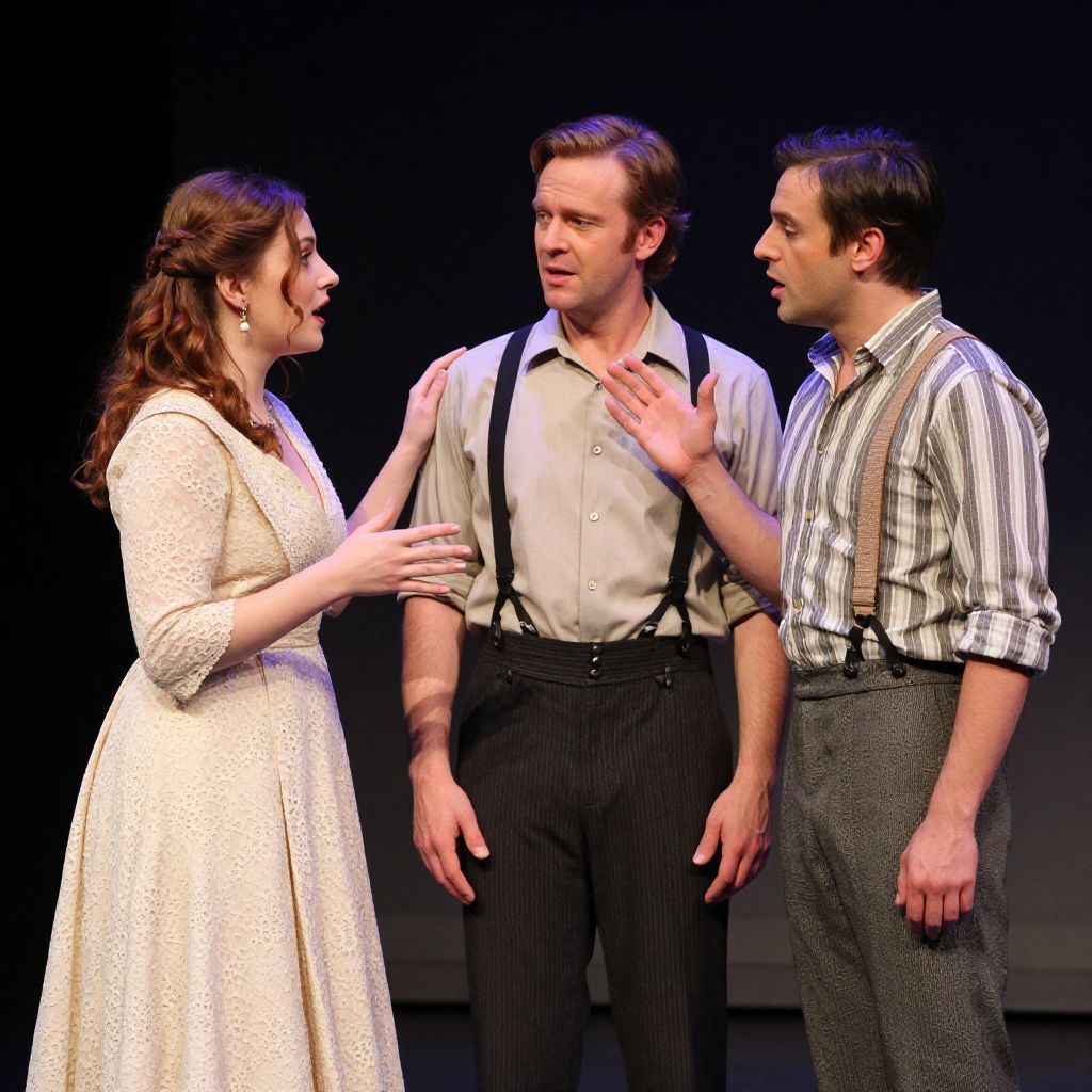 Photograph of three actors on stage: a woman with fair skin and brown hair in a white, long-sleeved, lace dress, standing left; a fair-skinned man with short brown hair in a white shirt, black suspenders, and black pinstriped pants, standing center; and a fair-skinned man with short dark hair in a green and white striped shirt and gray pinstriped pants, standing right. The woman gently touches the center man's chest while he looks at her, and the right man looks at the center man. The background is dark, highlighting the actors. The scene has a vintage, theatrical feel.