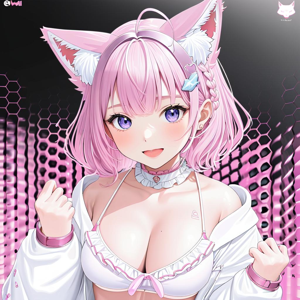 Digital illustration of a pink-haired anime wolf girl with wolf ears and tail wearing a white frilled bikini and a white hoodie. She has purple eyes, braided short hair with hair ribbons and ornaments, and a two-tone choker. The character poses with a bright smile, showing a fang, and has detailed features including large breasts, visible collarbone, and pink polished nails. The background shows a softly lit indoor setting.