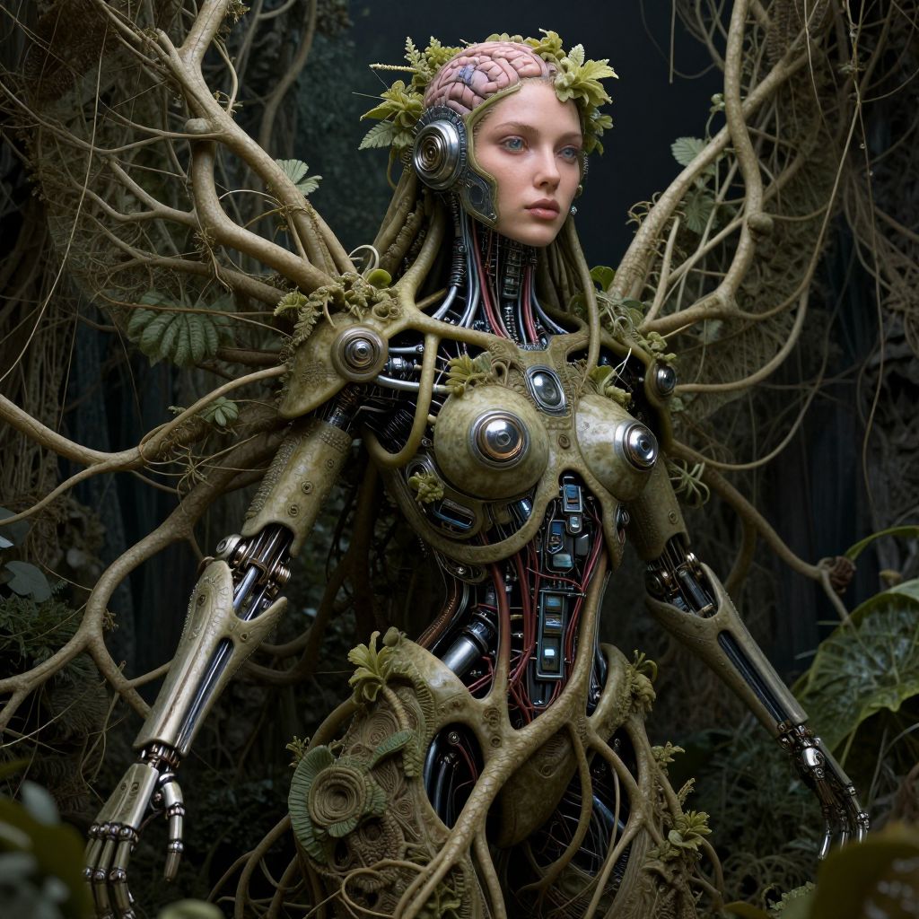 The image depicts a highly detailed and intricate scene of a biomechanical woman robot, blending elements of botanical and cybernetic design. The figure is adorned with a complex network of roots and tendrils, intertwined with metallic and electronic components, creating a striking contrast between organic and mechanical elements. The robot's eyes are large and expressive, with a metallic sheen, while its skin is composed of a mix of metal and plastic, with visible arterial wiring and electronic brain components. The background is dark, emphasizing the figure's detailed textures and the interplay of light and shadow. The overall composition is dynamic, with the robot's form occupying the central space, surrounded by a web of roots and tendrils that extend outward, creating a sense of depth and complexity. The scene is rich in detail, with a mix of botanical and technological motifs, evoking a sense of a virtual reality garden or a sacred grove of biomechanical dryads. The image is hyperdetailed, with a focus on intricate textures and spatial relationships, showcasing the fusion of organic and mechanical elements in a visually striking and thought-provoking manner.
