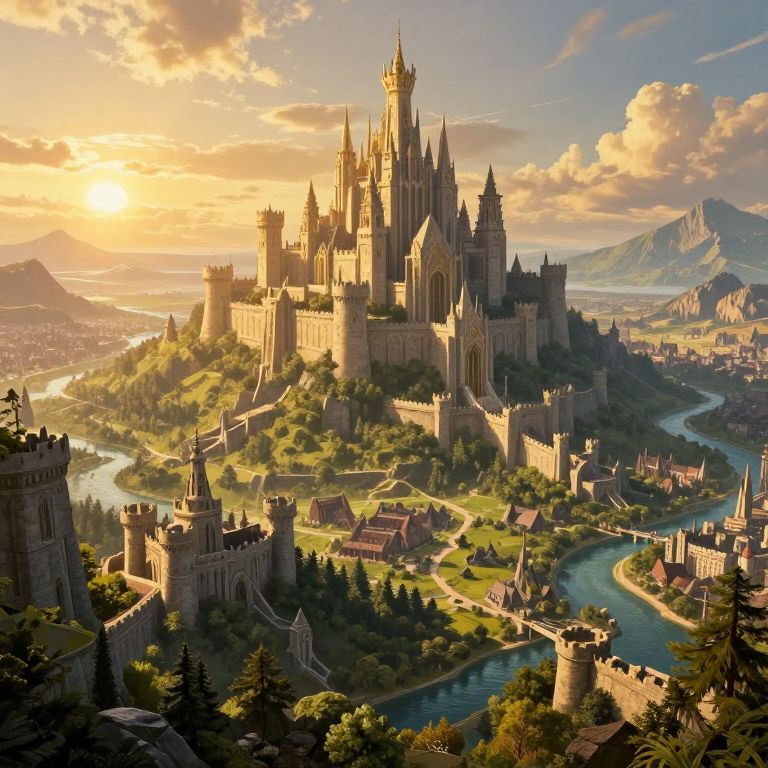 This is a digital artwork of a majestic, medieval-style castle perched on a lush, green hilltop. The castle, with its tall spires and grand towers, dominates the center of the scene, bathed in warm, golden sunlight from a setting sun in the background. Surrounding the castle are smaller, stone-built structures and quaint houses with red roofs. A winding river flows through the valley, reflecting the sunlight. The landscape includes dense forests, rolling hills, and distant mountains under a partly cloudy sky. The overall style is realistic with a fantasy touch, emphasizing the grandeur and beauty of the castle and its surroundings.