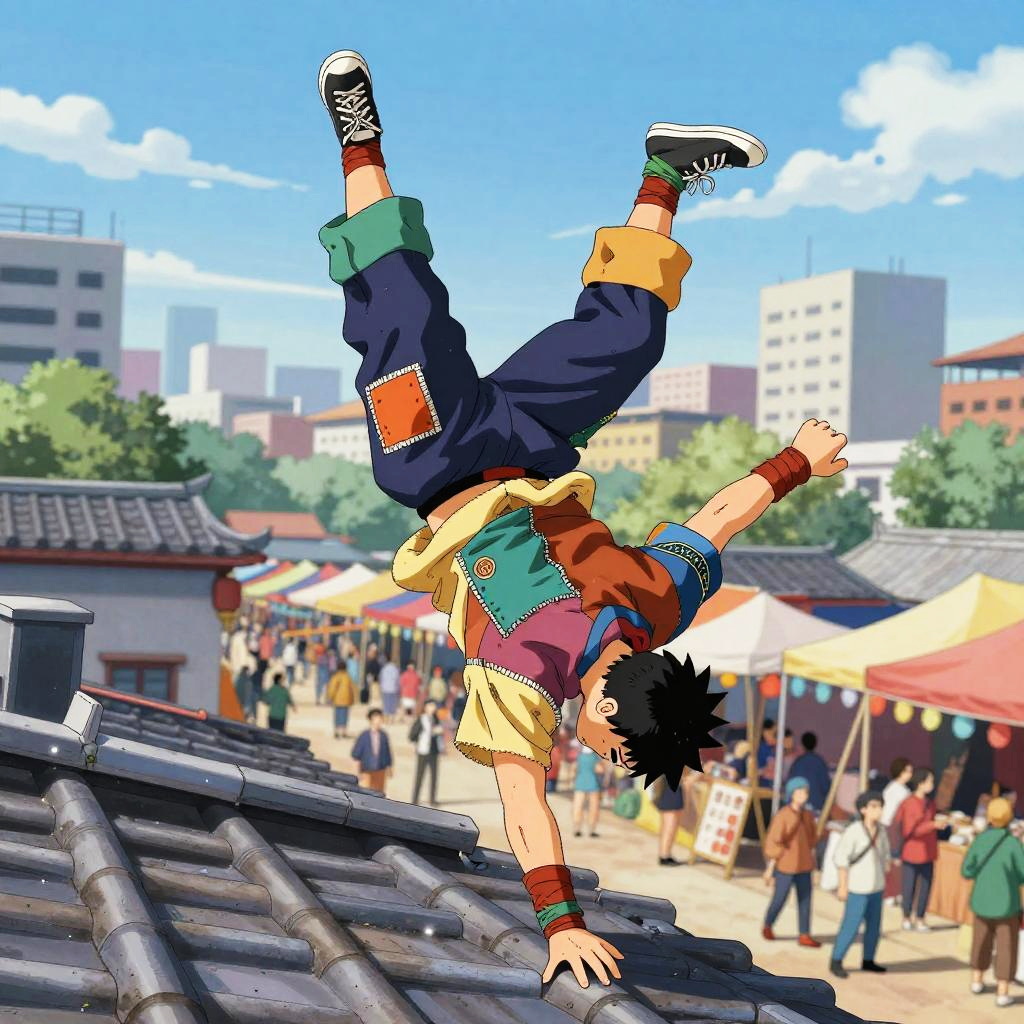 An agile street performer acrobat, wearing colorful patched clothes mixed with ninja wraps, engaged in performing a high-flying flip over rooftops, set in a lively city festival, illustrated in the humorous yet action-packed anime style of Hideaki Sorachi.