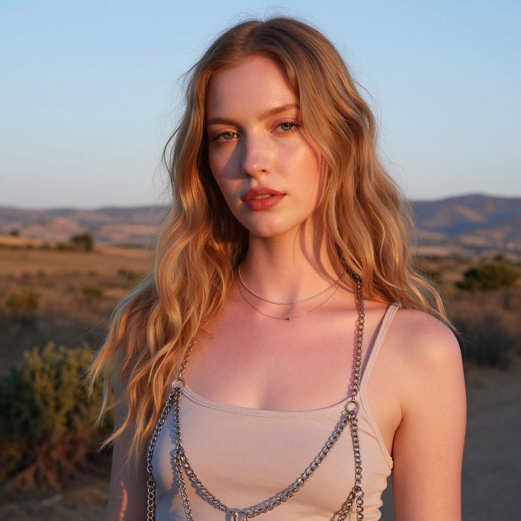 Blonde hair cascades gracefully over bare shoulders as a woman stands amidst golden sand dunes under a clear sky, her gaze directed toward the camera, embodying serenity against the vast expanse of the desert landscape.