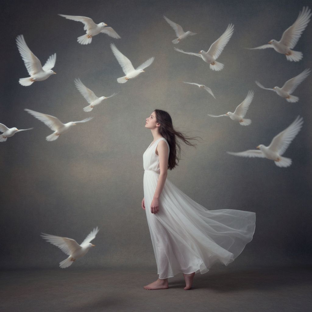 Photograph of a serene woman in a flowing white dress, barefoot, standing sideways as white doves circle her against a dark, gradient background.