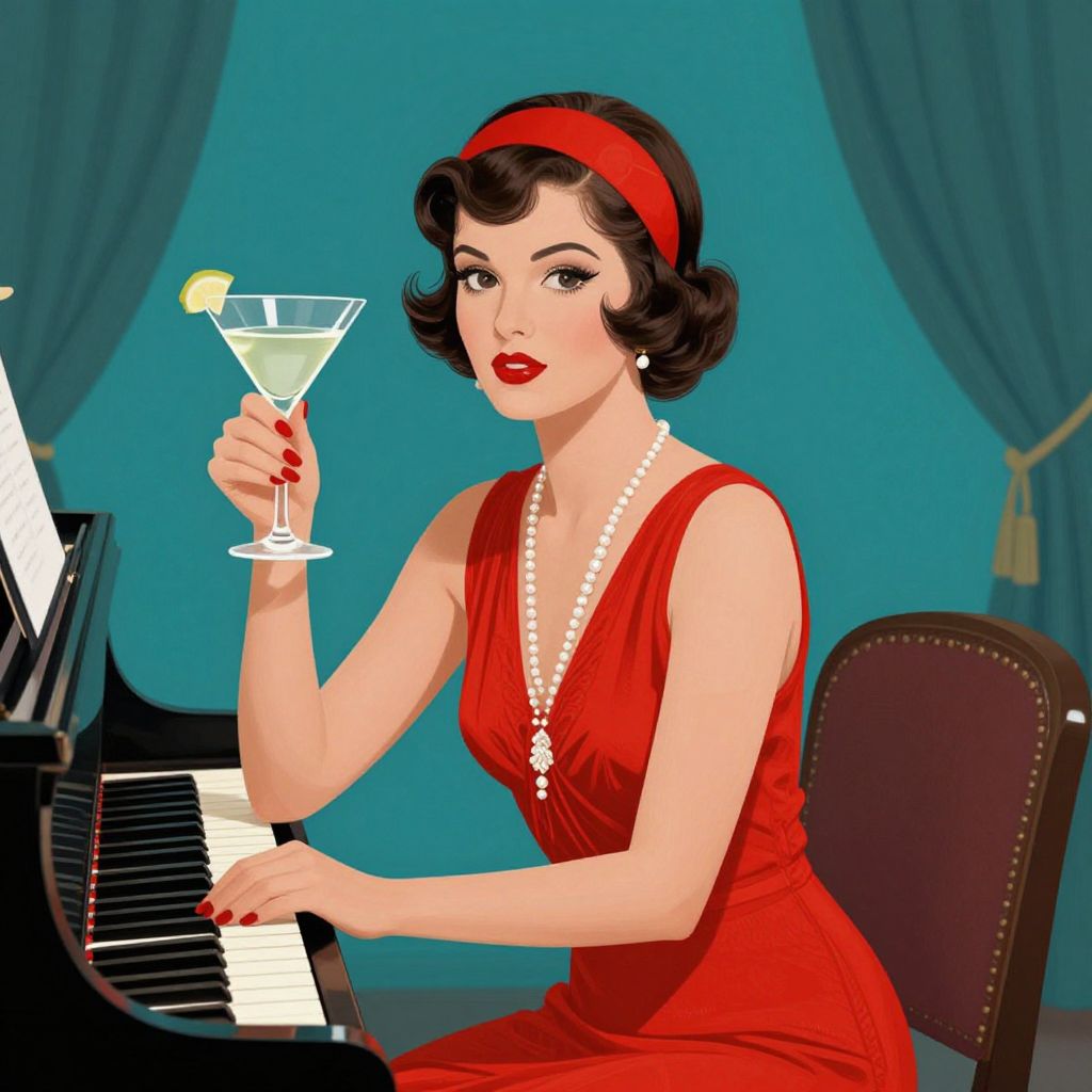Vintage-style digital illustration of a fair-skinned woman with red lipstick, black wavy hair, red bow, pearl necklace, black dress, smoking a