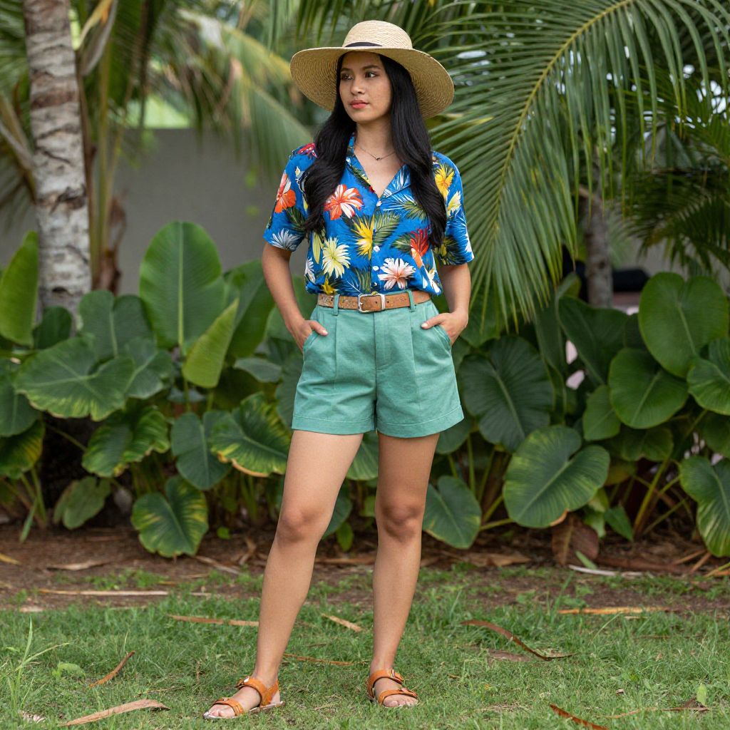 Tropical attire female, 1girl, solo, hat, shorts, sandals, long hair, hands in pockets, shirt, black hair, hawaiian shirt, full body, green shorts, standing, lips, belt