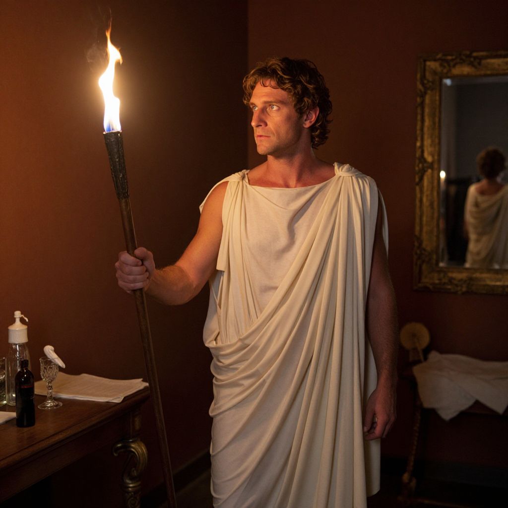 Photograph of a muscular man with wavy brown hair, wearing a white toga, holding a torch, standing in dimly lit room. Reflect