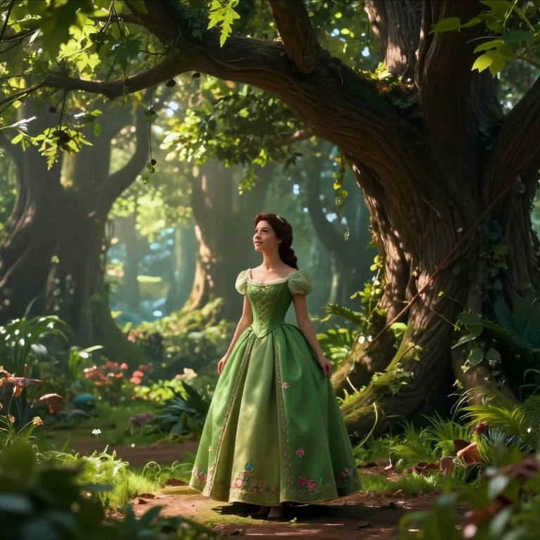 A cinematic wide shot of a Disney princess in a lush, enchanted forest, dressed in a classic green dress with embroidered floral patterns, standing beneath a giant tree with sunlight filtering through the leaves, her face radiant and serene as she gazes into the distance