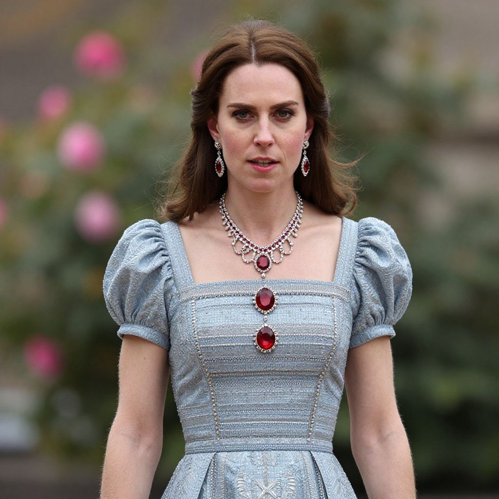 Queen elizabeth fancy dress, 1girl, solo, blurry background, flower, blurry, dress, brown hair, looking at viewer, earrings, puffy sleeves, jewelry, red lips, shirt