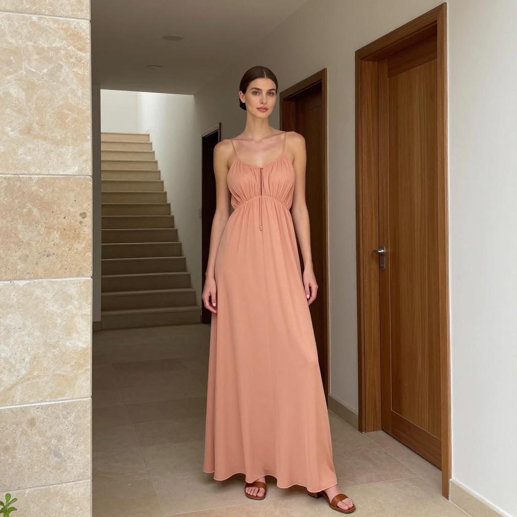 Pink woman sandy costume, photograph of a young woman standing outdoors, wearing a pink flowing cloak, matching short dress, and sandals, long brown hair partially covered by the cloak, serious expression, green shrubbery in the background, stone wall, sunny day, full body shot, ethnic features, simple natural setting, realistic lighting, soft pink and beige colors, casual yet elegant attire, standing on a paved surface, relaxed pose