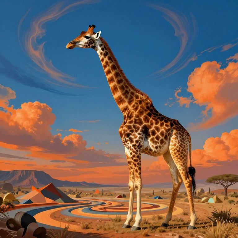 A captivating blend of mathematical intricacy and expressive coloration illuminates this surreal landscape. A majestic giraffe, rendered in hyperrealistic detail, stands regally amidst an enigmatic terrain, its elongated neck reaching towards a boundless sky adorned with swirling clouds of rich blues and vibrant oranges. The disorienting geometry of the ground beneath its feet challenges perception, creating a mesmerizing visual that evokes both awe and wonder as it gracefully traverses this mind-bending tableau.
