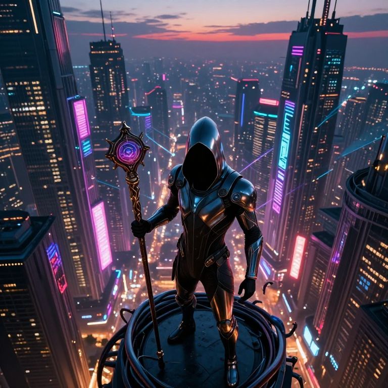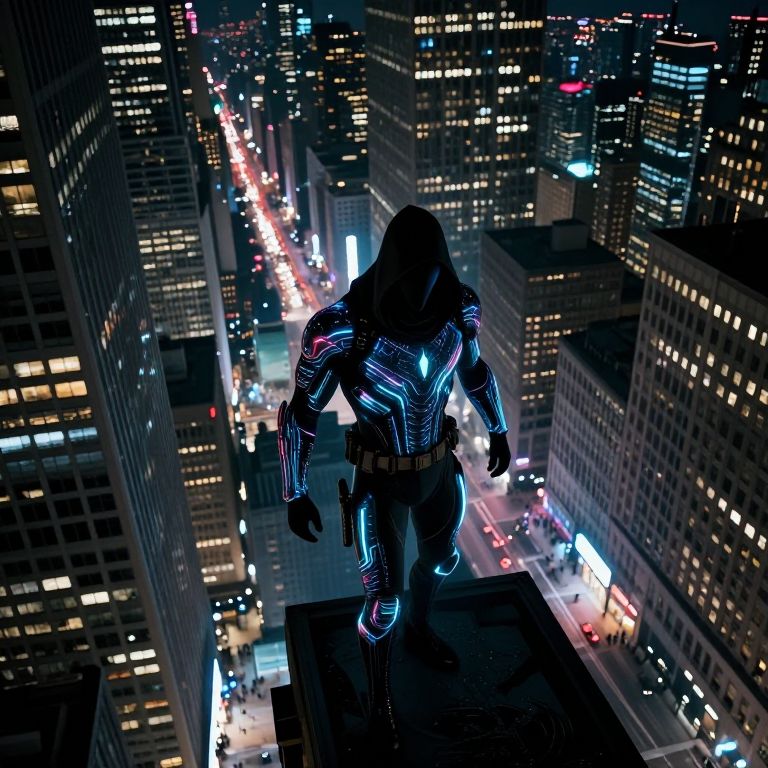 Craft an image reminiscent of a cyberpunk comic book narrative, portraying a futuristic metropolis with towering skyscrapers reflecting vibrant neon lights and holographic billboards. The scene is captured from an aerial perspective, revealing the frenetic pace of an urban jungle replete with flying vehicles and intricate networks of high-speed transit lines. Amidst this digital wilderness, a solitary figure appears—a masked crusader clad in vivid, glowing armor that radiates bioluminescent energy, creating a striking contrast against the dark backdrop. This character is depicted mid-leap, gracefully navigating between towering structures with remarkable agility, instilling both reverence and unease as they maneuver through this tapestry of light and darkness.