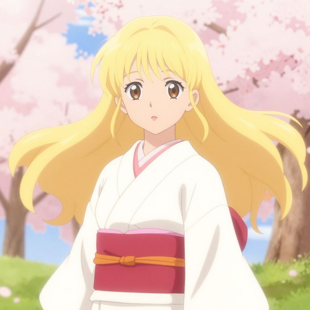 Red and white hair anime girl in a traditional kimono, cherry blossoms gently falling around her, soft pastel palette, peaceful garden setting, elegant pose with a gentle smile, delicate brushstroke-style anime illustration