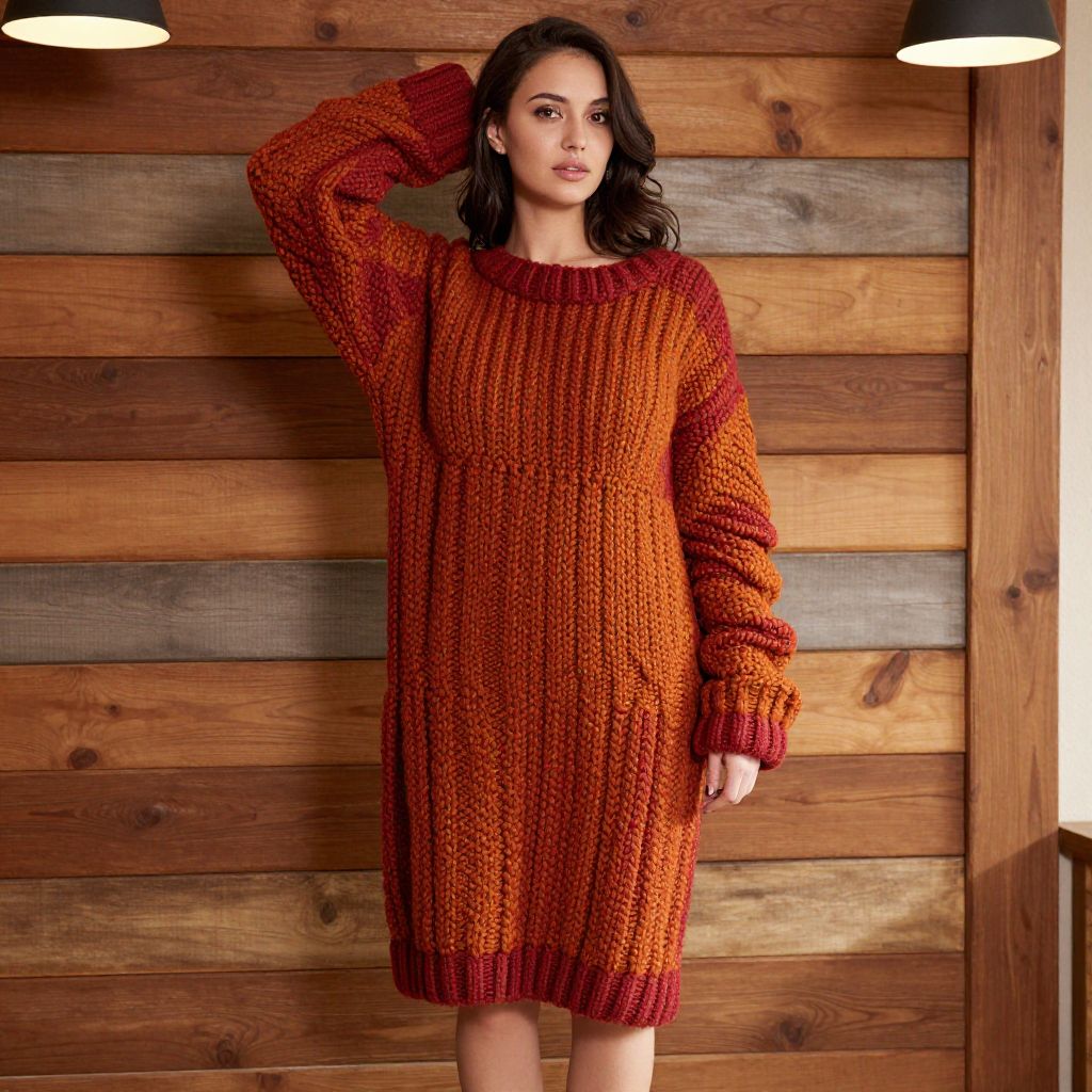 A full-body lifestyle photo of a modern woman in her early 30s with warm brown eyes and soft, defined features, posing casually in front of a rustic wooden wall. She is wearing a large, chunky textured knit sculpture that dominates her silhouette—layered with a deep red and mustard hue, giving it a cozy, autumnal vibe. The room is warmly lit with a mix of sunlight and soft overhead lamps, emphasizing the texture and three-dimensionality of the knit.. The woman has big tits and cute face