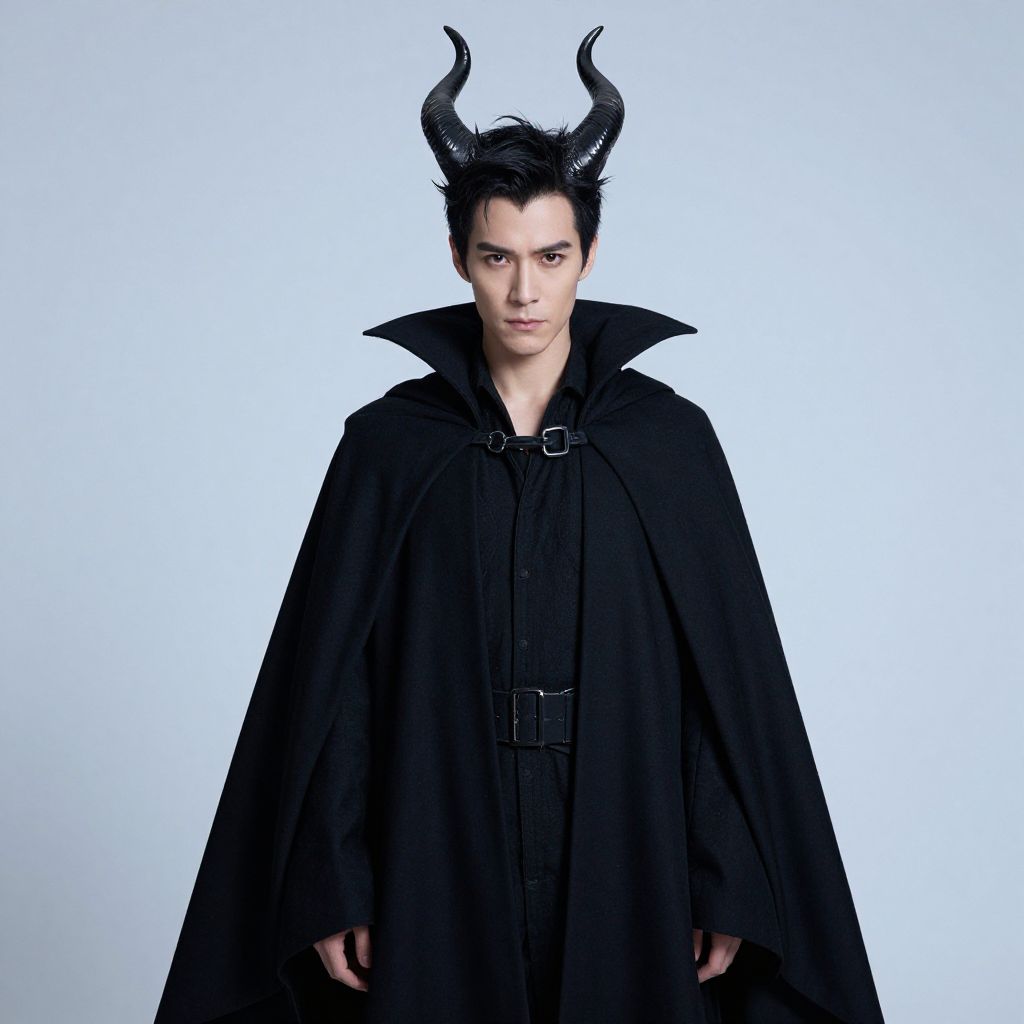 Photograph of a young man with pale skin and black hair, wearing a black cloak with a high, wide collar and buckle closures at the front. He has black, curved horns on his head and a serious expression on his face. The background is a solid, bright white, making the dark colors of his attire and horns stand out. The lighting is even, highlighting the textures of the cloak and the sharpness of the horns. The overall style is gothic and mystical.