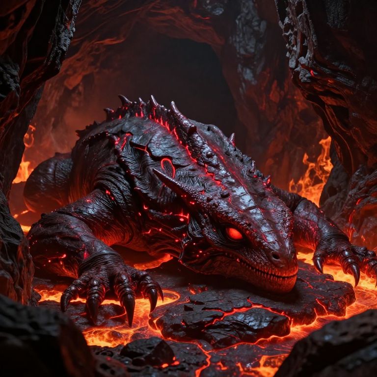 Digital illustration of a fierce, black-scaled dragon with glowing red eyes and spikes, resting in a dark, rocky cave with vibrant red and orange mol