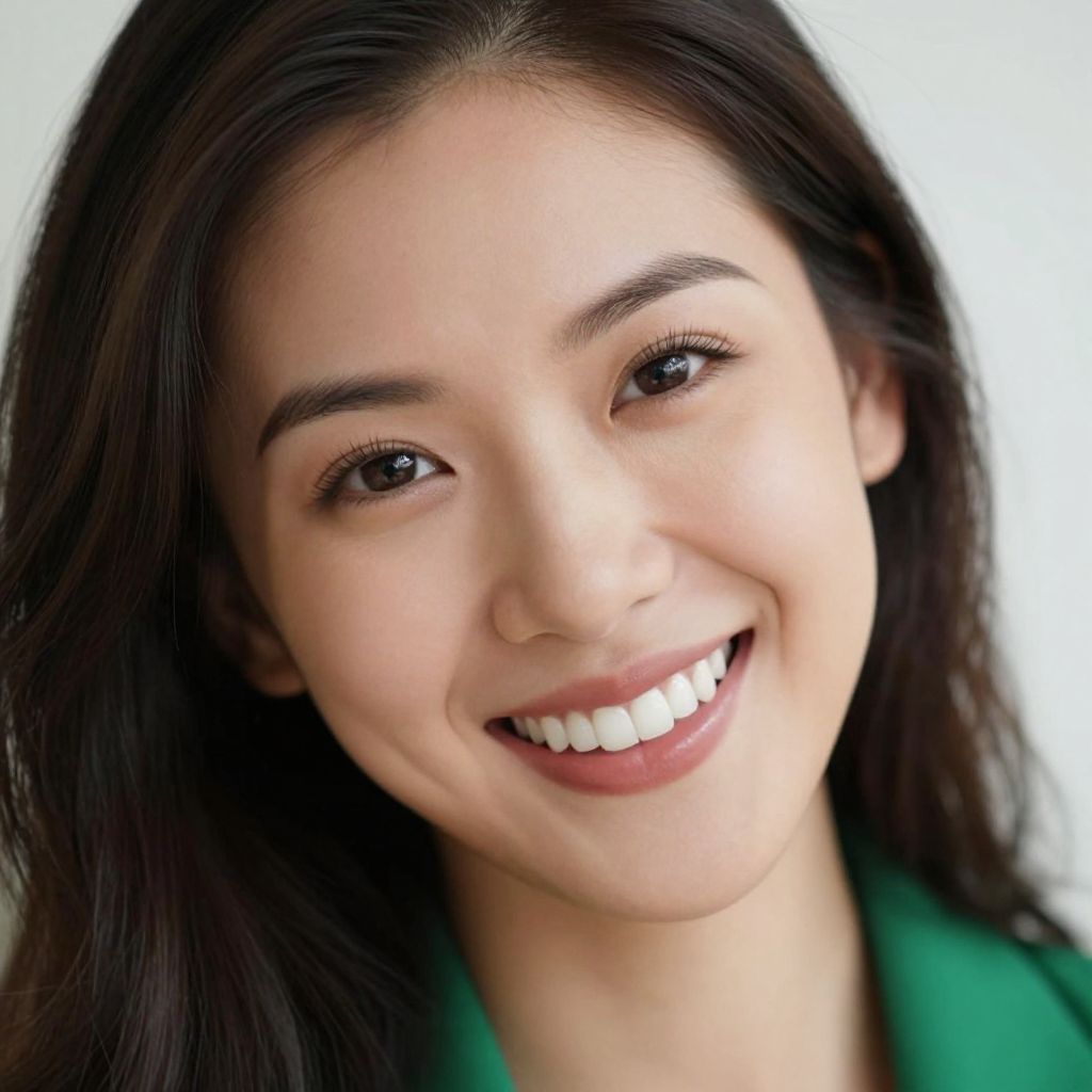 Photograph of a smiling young Asian woman with straight black hair, green eyes, fair skin, and wearing a green shirt against a white background.