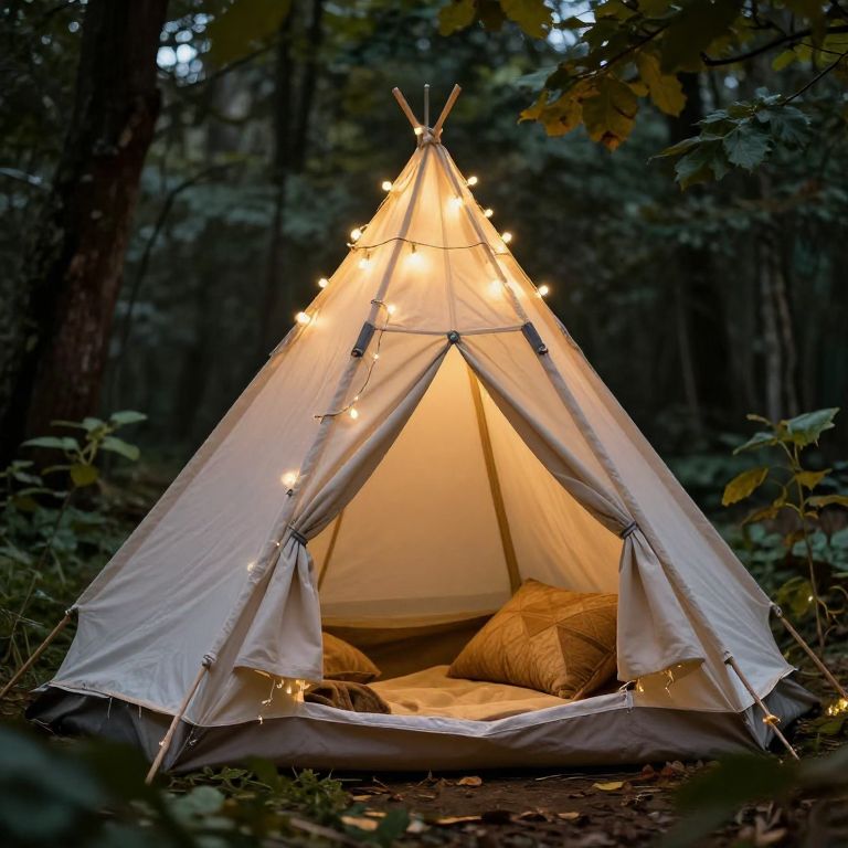Enveloped in the soft glow of fairy lights, this dreamy tent cradles a sanctuary of serenity, where the gentle rustle of leaves and the warmth of cozy textures invite a retreat into the embrace of nature’s timeless embrace.