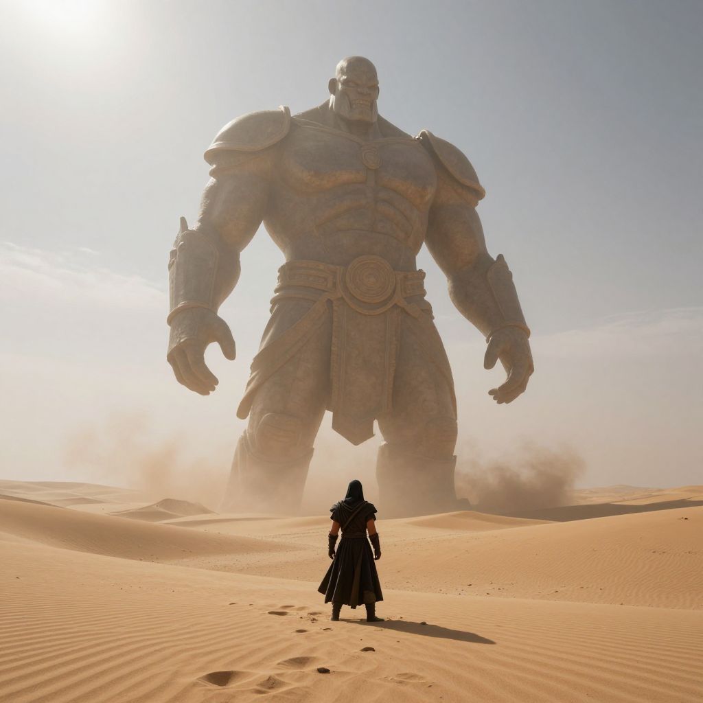 A lone warrior clad in flowing robes stands defiantly against a colossal, armored titan looming over a desolate desert landscape, where the vastness of the scene defies the scale of human endeavor.