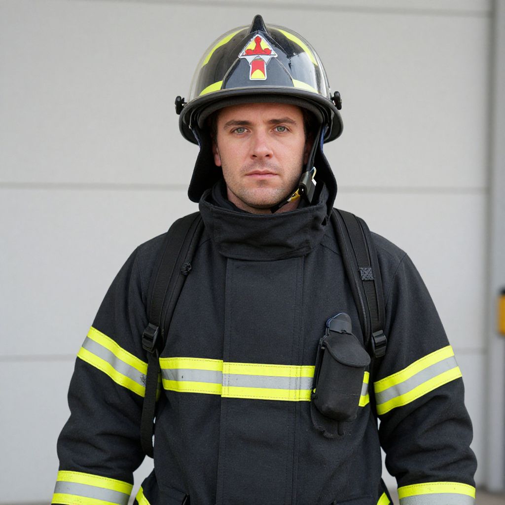 Photograph of a Caucasian male firefighter with light skin, short brown hair, and blue eyes. He wears a black fire-resistant jacket with yellow reflective stripes, a black hood, and a silver fire helmet with a red and white emblem on the front. A black communication device is attached to his jacket's left side. The background is a plain white wall with subtle paneling. The firefighter's expression is neutral, and he stands centrally in the frame, facing the camera. The image is brightly lit, highlighting the firefighter's uniform and equipment.