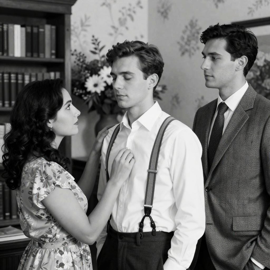 Black-and-white photograph of three people. A man in a white shirt with suspenders stands center, eyes closed. A woman with dark hair in a floral dress touches his chest. A man in a checkered suit stands to the right, looking ahead. Background: bookshelf, floral wallpaper, large flower arrangement. Woman looks up at man with suspenders, his hand on her shoulder.