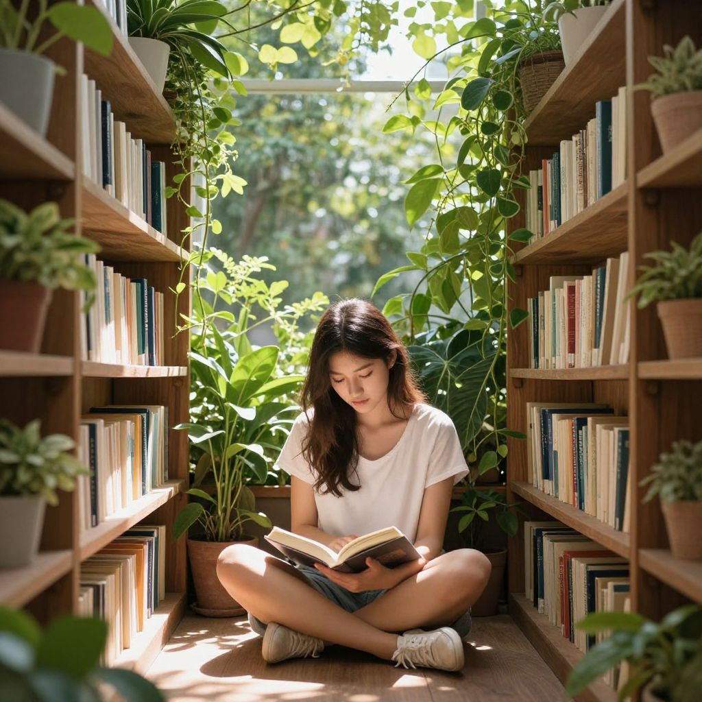 Serene sunlight filters through lush green foliage as a young woman sits cross-legged between wooden bookshelves, her hands gently cradling an open book, surrounded by vibrant plants that intertwine with the shelves, creating a tranquil reading nook where nature and literature converge.