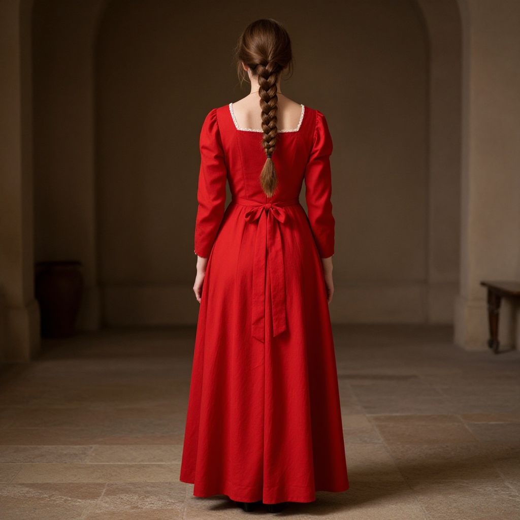 "Simple Renaissance Dress, woman in a red dress with a braid in her hair"