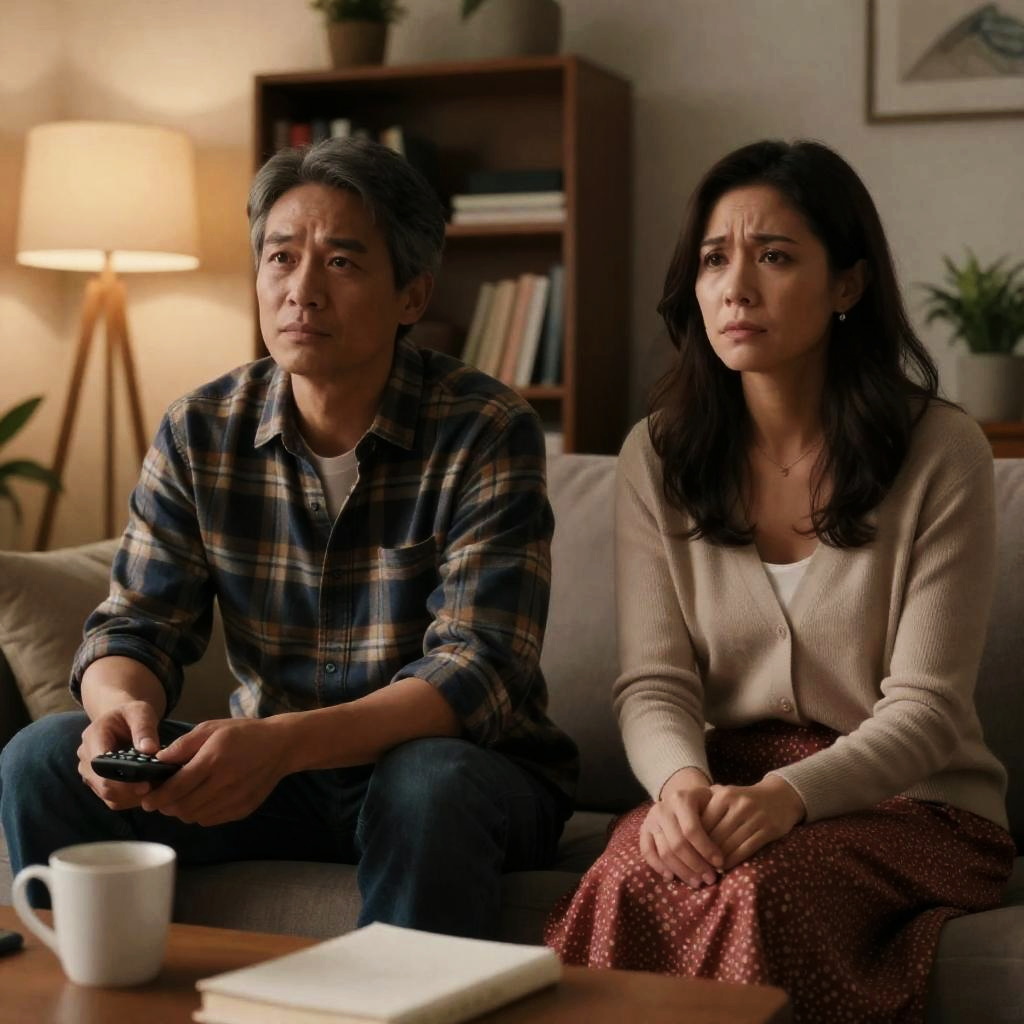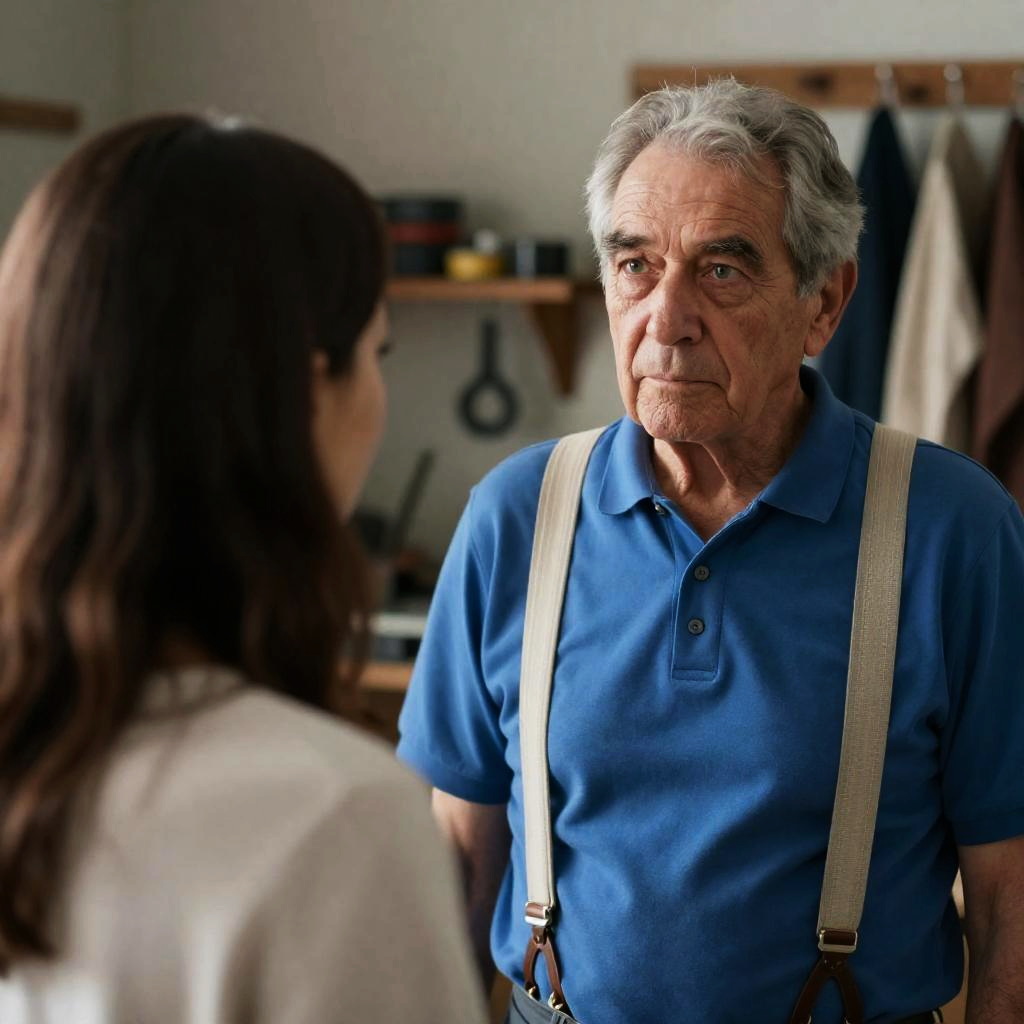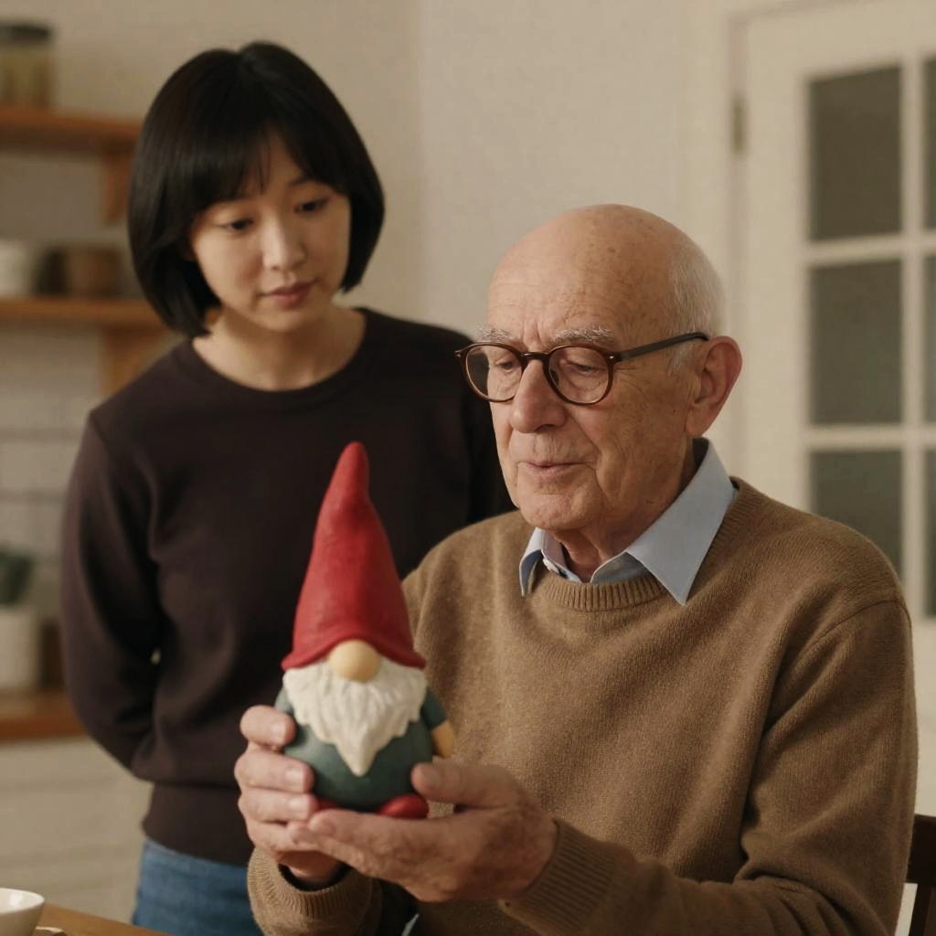 Photograph of an elderly man with bald head, glasses, and brown knitted sweater, holding a gnome figurine with a red pointy hat. A young woman with short black hair and dark brown top stands behind him, looking down. Beige kitchen background with shelves and glass door. Warm lighting.