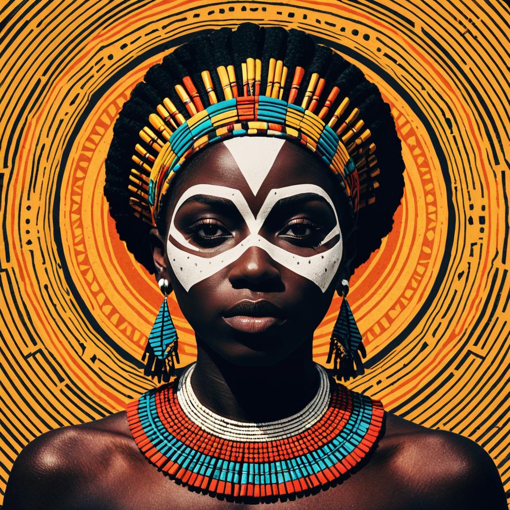 Portrait of an African woman wearing traditional tribal attire including a colorful beaded necklace, matching earrings, and a vibrant headwrap. Her face is decorated with white geometric face paint. The background features an abstract circular pattern in orange and black, complementing her attire.