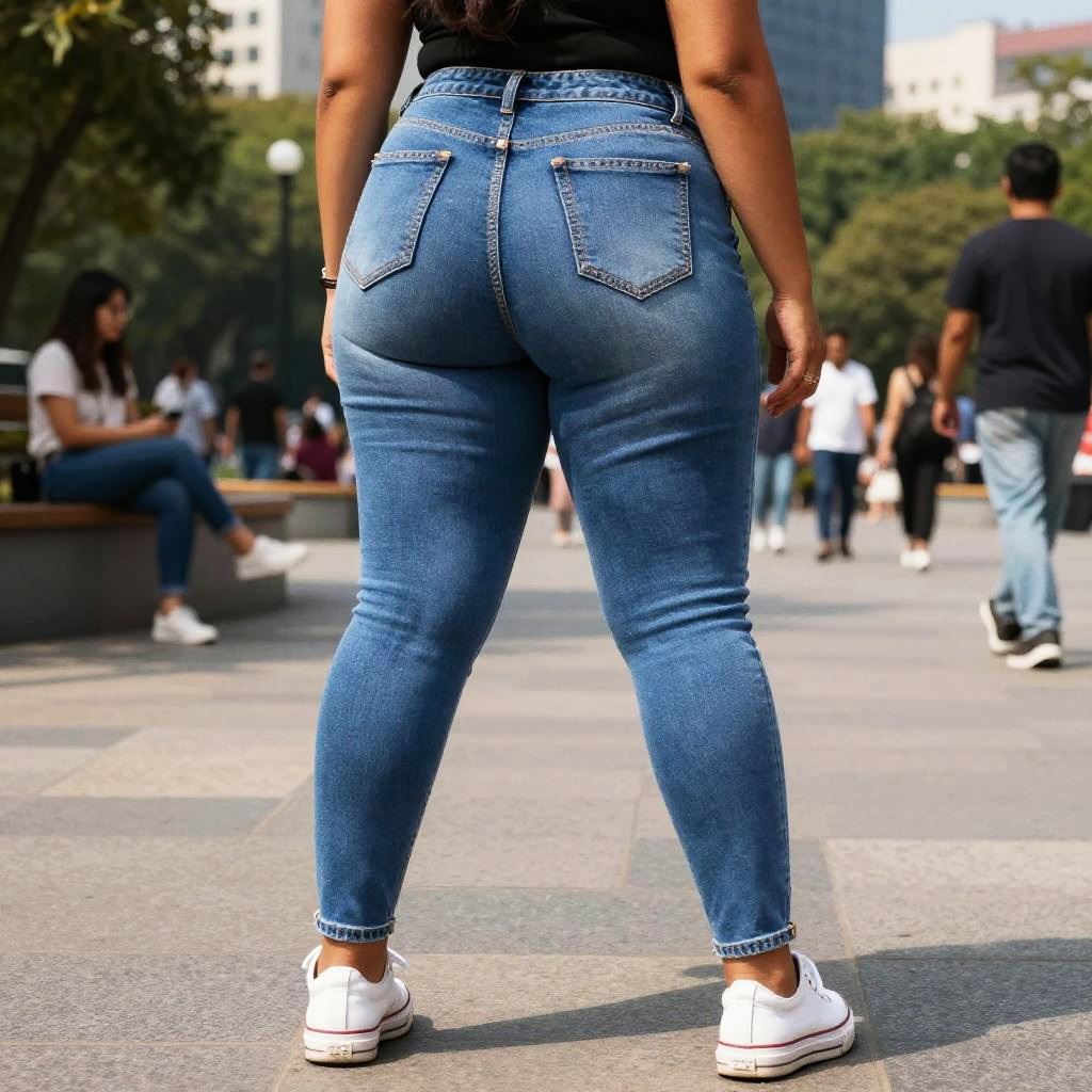 Fat ass jeans on confident model, vibrant street fashion, perfect fit highlighting curves, intricate stitching details, sunny city park setting, lively atmosphere