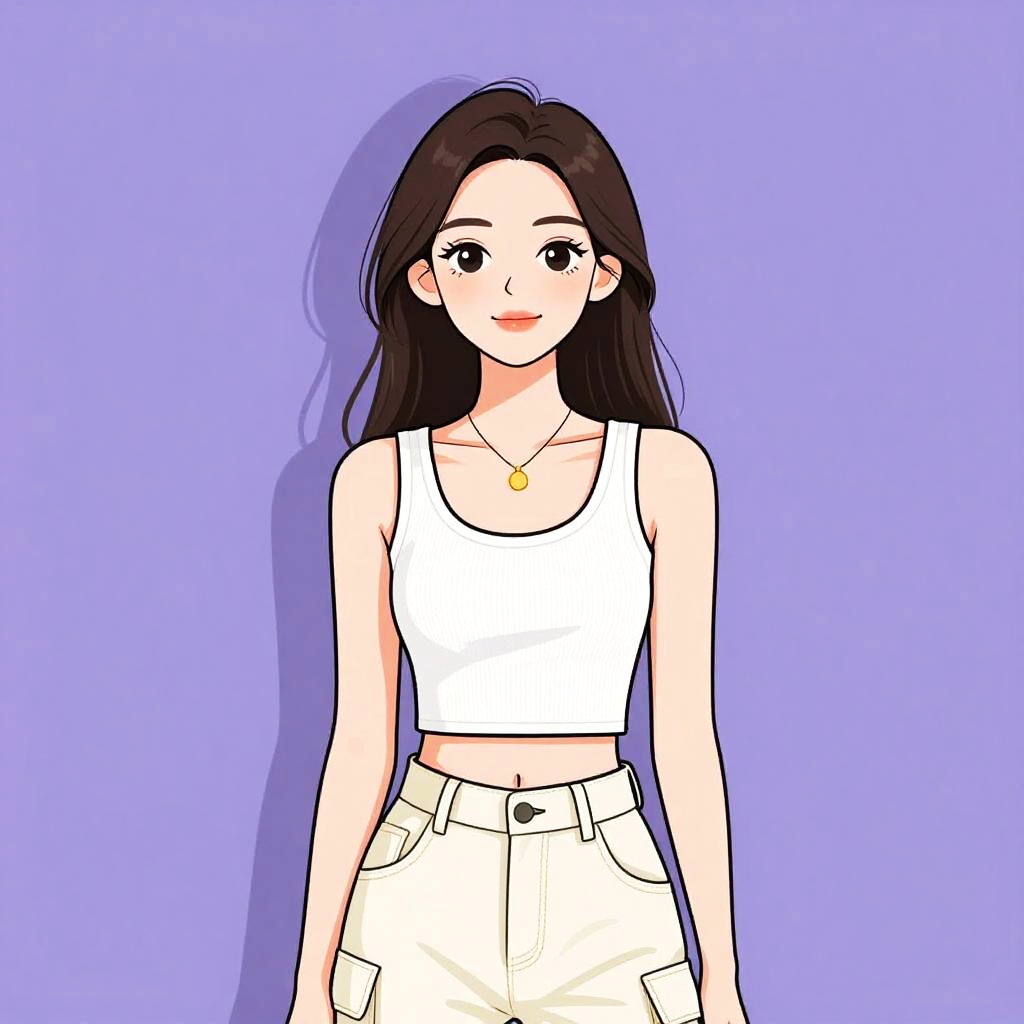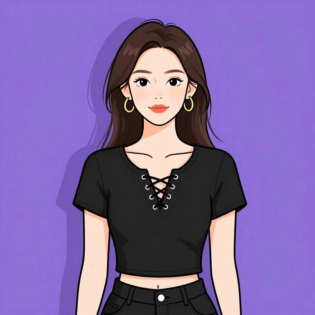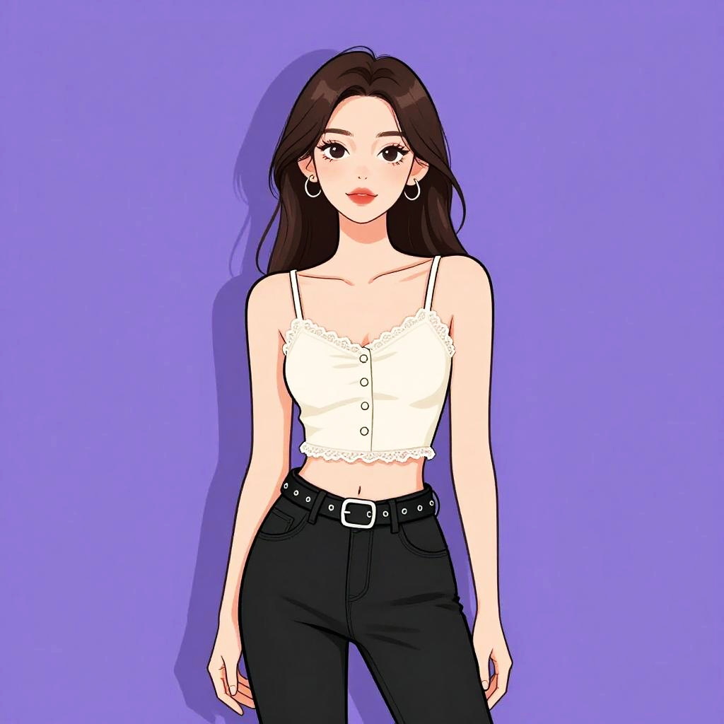 Woman with pretty face and pretty hair. Woman, streetwear, black cropped tube top with central zipper, elastic hem with brand label detail, matching black joggers with high waist, drawstring, relaxed fit, silver chain necklace, minimal makeup, white studio background. --sref 1467