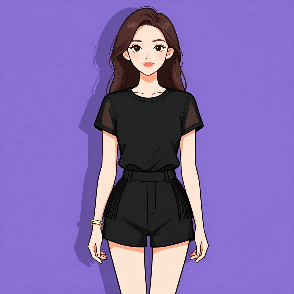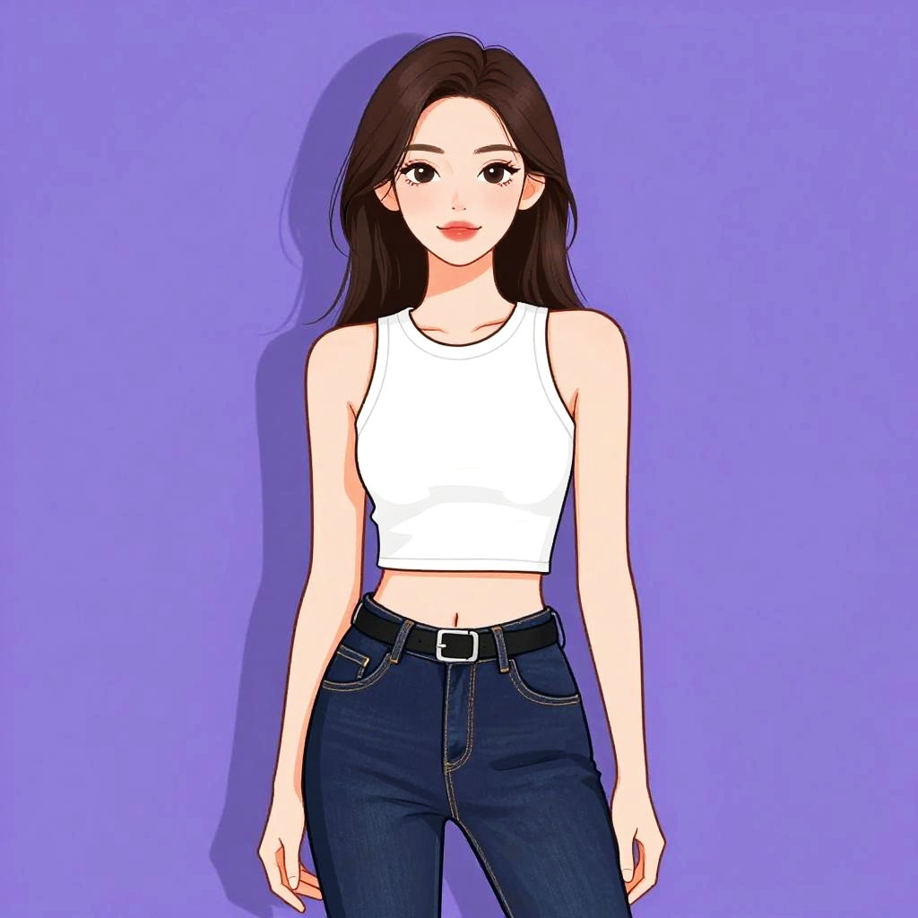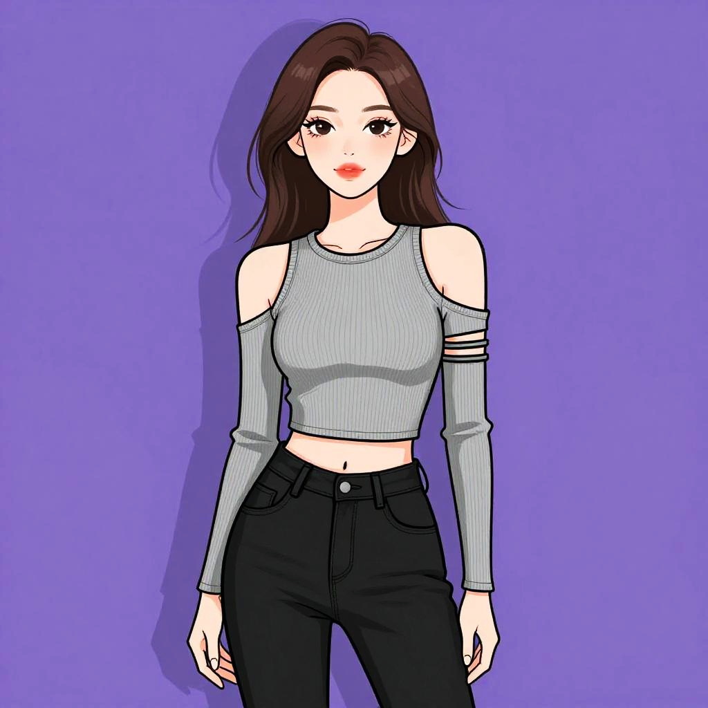 Woman with pretty face and pretty hair. Woman, streetwear, black cropped tube top with central zipper, elastic hem with brand label detail, matching black joggers with high waist, drawstring, relaxed fit, silver chain necklace, minimal makeup, white studio background. --sref 1467
