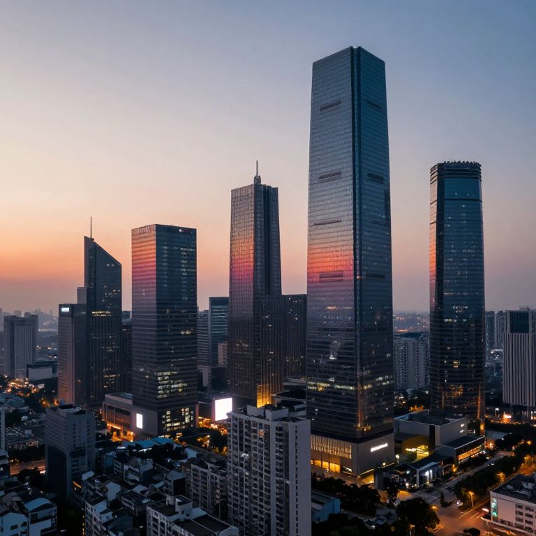 A surreal, abstract collage depicting a futuristic cityscape at twilight, with skyscrapers composed of shimmering glass and neon-lit buildings blending seamlessly into the sky. The scene is viewed from a bird's-eye perspective, hovering above the bustling metropolis, providing an aerial vantage point that captures both the majesty and chaos of urban life. The dominant color palette consists of deep purples, glowing blues, and vibrant yellows, evoking a sense of mystery and excitement as the city transitions from day to night. This imaginative composition reflects on humanity's dreams and fears, creating an emotional gradient that invites viewers to explore their own reflections within this captivating visual symphony.